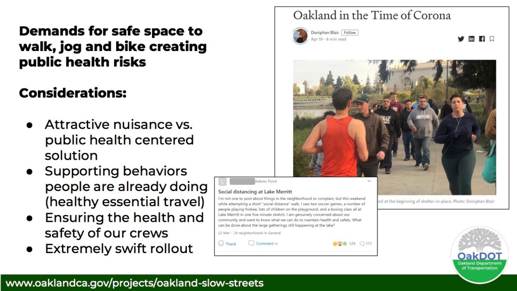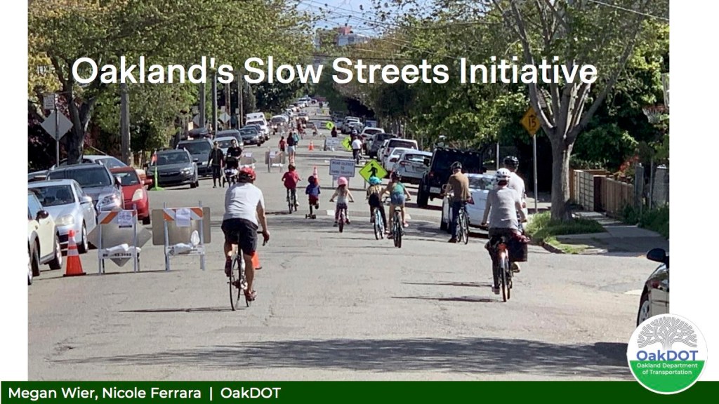 At the June 18, 2020 BPAC meeting, Nicole Ferrara, OakDOT Policy and Intergovernmental Affairs Advisor, and Megan Wier, Safe Streets Division Manager, presented an overview of Oakland’s Slow Streets initiative in response to COVID-19, community engagement, its evolution to date, and planning for the next phase as the county gradually reopens. Here are the presentation slides, followed by a summary of discussion: