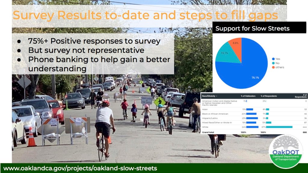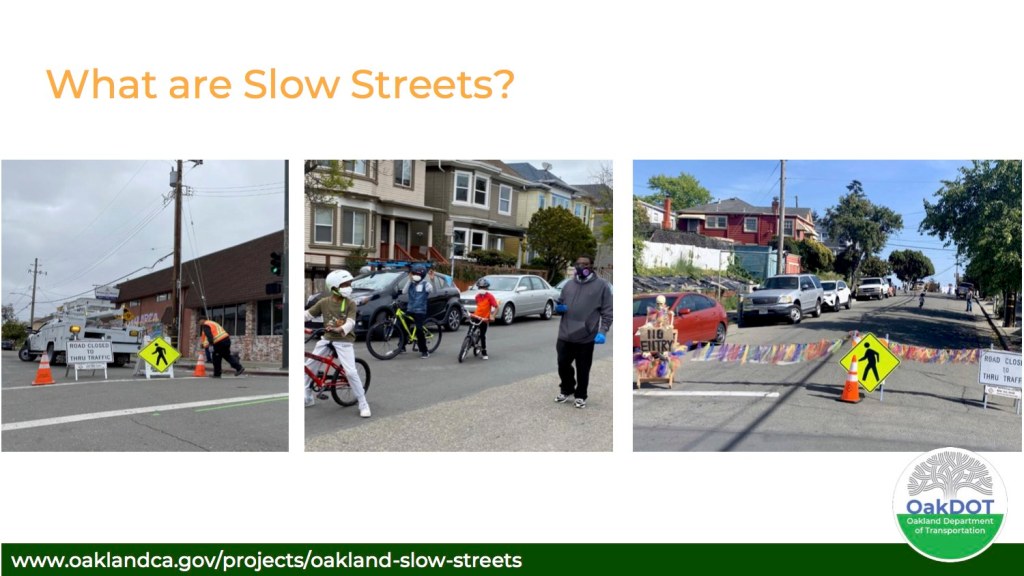 - Slow Streets have been great for parents and kids being in the street together. However, this benefit is not distributed across Oakland, with the streets in North Oakland being more conducive to children playing than the streets in East Oakland, even with the partial street closures.