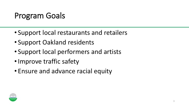 At the July 16, 2020 BPAC meeting, Warren Logan, Mayor’s Policy Director of Mobility and Interagency Relations provided an overview of the City’s Flex Streets program for business’ use of sidewalks and public rights of way for physical distancing during COVID- 19. The presentation also provides an update on next steps and coordination with Alameda County Shelter in Place orders.
