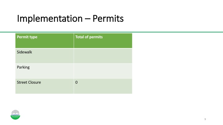 - Of the 100 permit requests received, 65% requested both sidewalk and parklet space and 10% requested sidewalk space only.