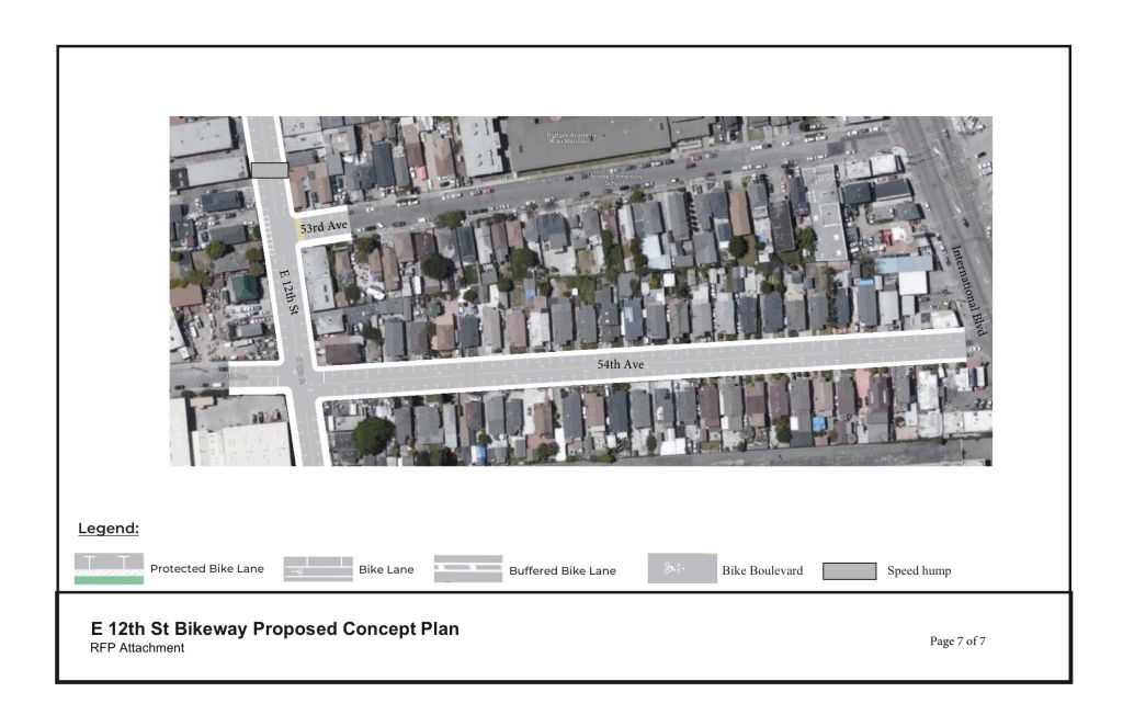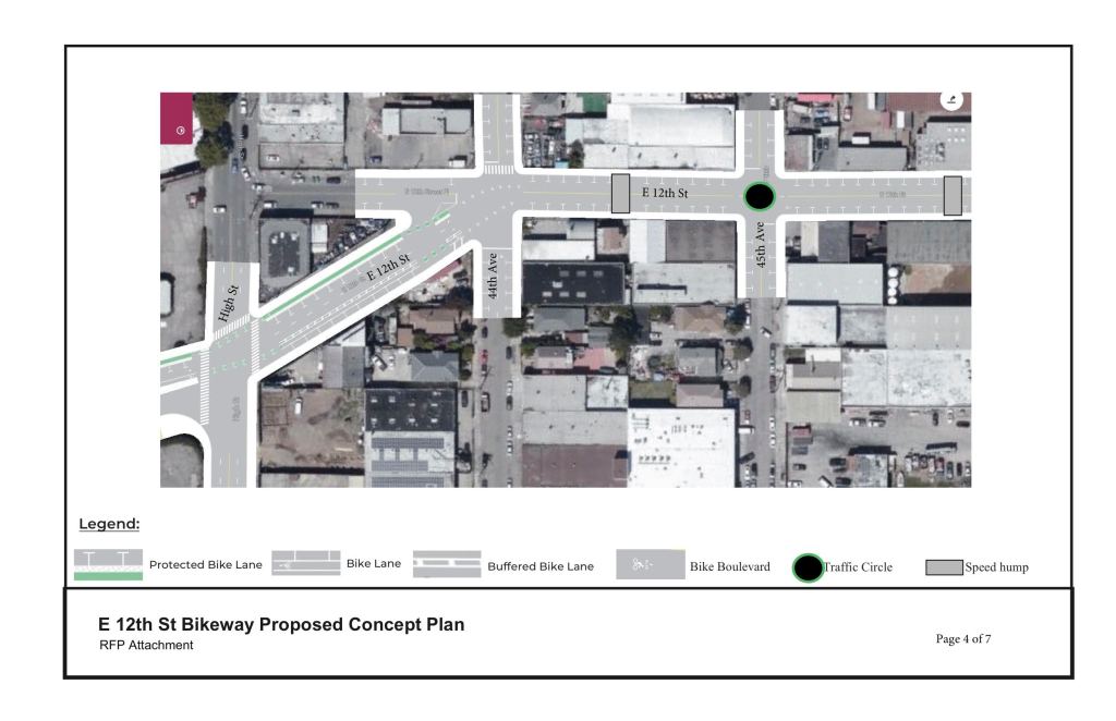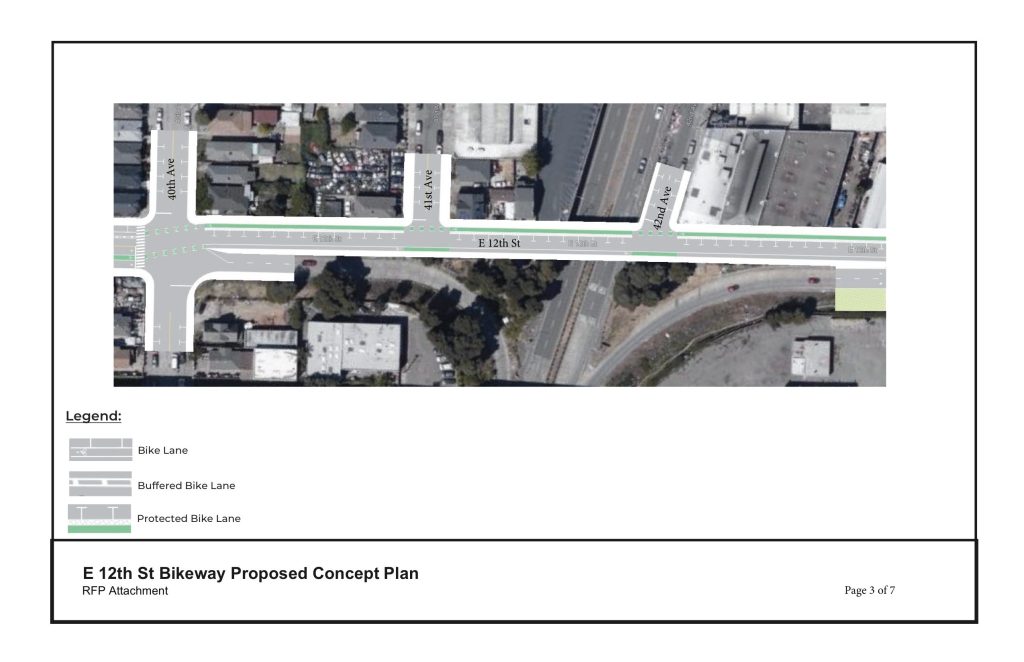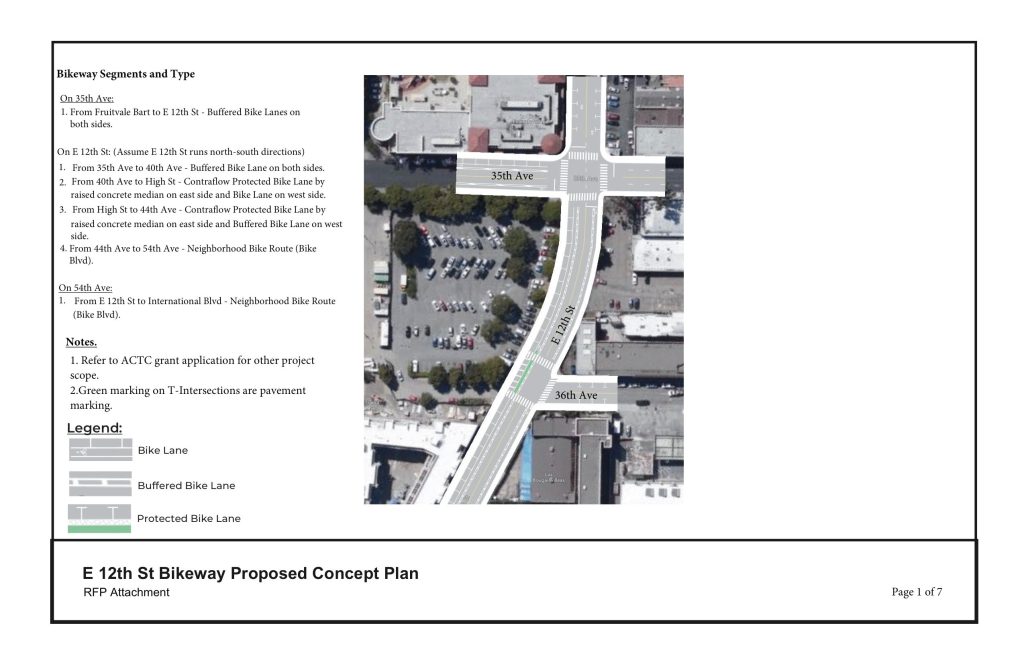 This project proposes a bikeway on E 12th Street from 35th Avenue at Fruitvale BART station to 54th Avenue. The bikeway includes different bikeway designs depending on the street context. The concept plans are below.