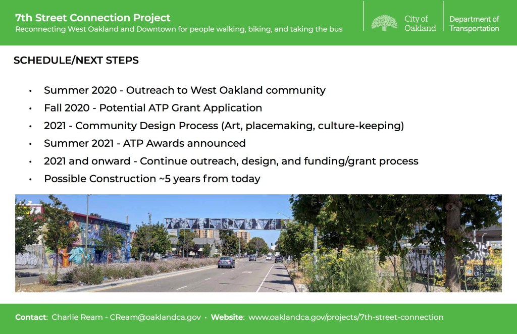 At the August 6, 2020 Infrastructure Committee meeting, Charles Ream, OakDOT staff presented on the 7th Street Connection Project, that the City is preparing an Active Transportation Program (ATP) application for.