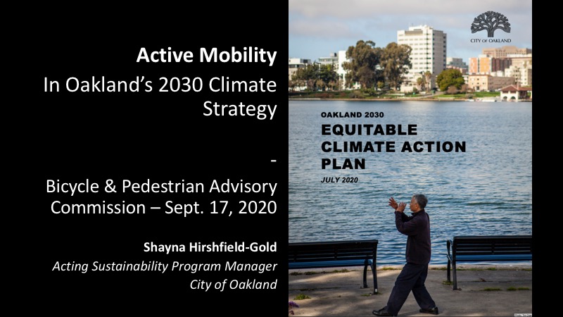 At the September 17, 2020 BPAC meeting, City of Oakland Acting Sustainability Program Manager Shayna Hirshfield-Gold provided an overview of the adopted 2030 Equitable Climate Action Plan (ECAP), with a focus on the transportation-related elements of the plan. Jump to the presentation.