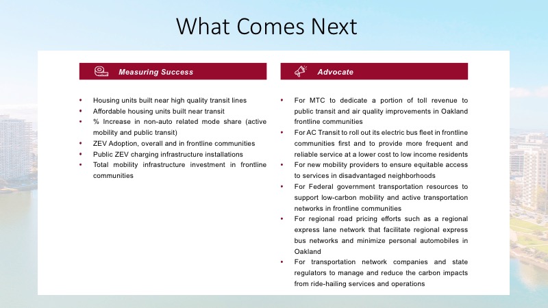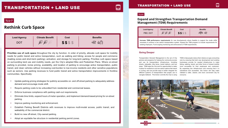Integrated land use and access to safe, reliable, low-cost, high-quality mobility options for every Oaklander enable an equitable transition away from cars. Auto use is minimized, and all remaining vehicles on Oakland roads are electric.