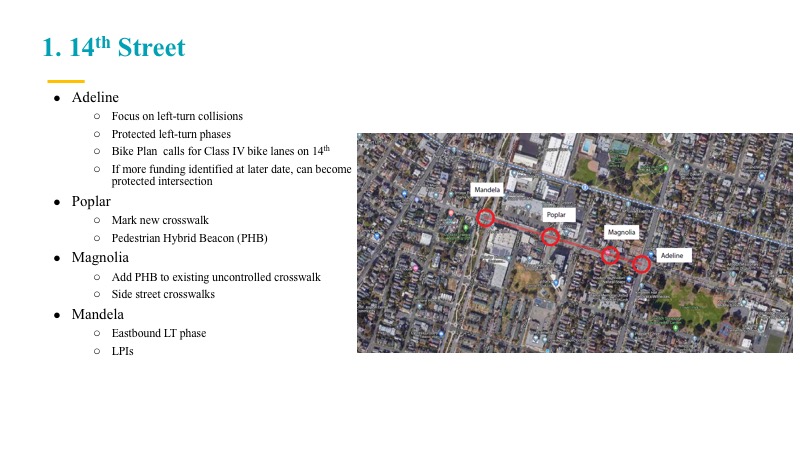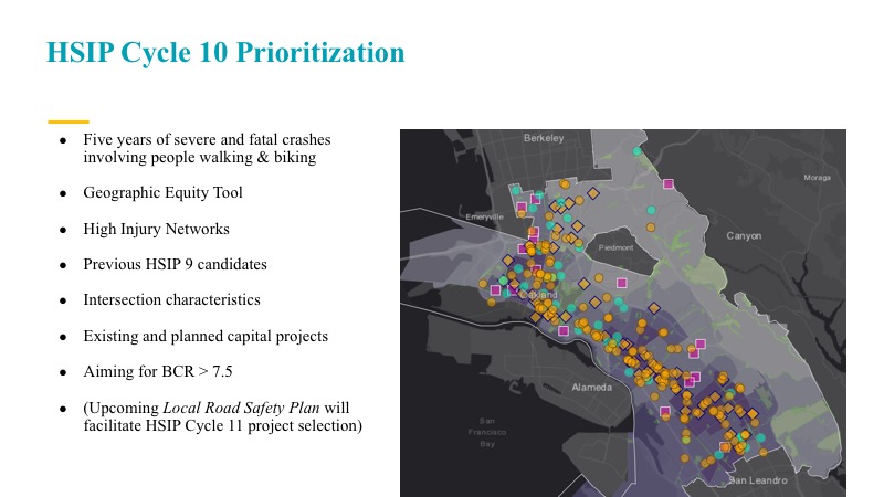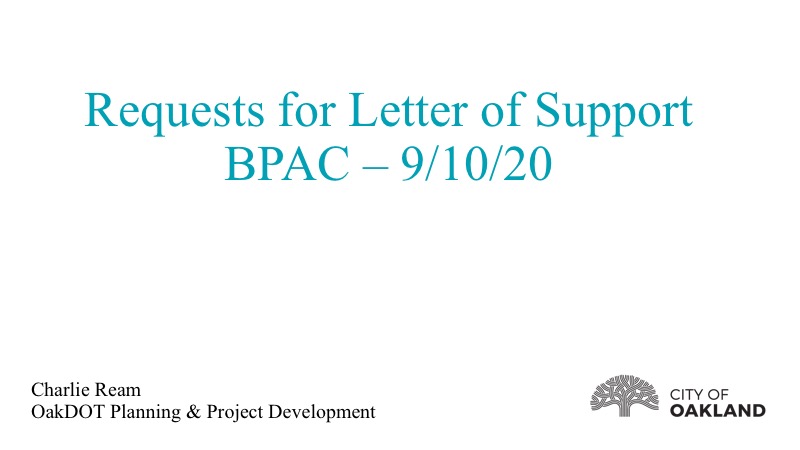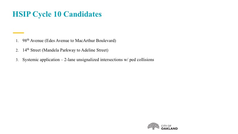 At the September 17, 2020 BPAC meeting, OakDOT Staff Teresa Peterson and Charlie Ream presented the one systemic project and two corridor specific projects selected for HSIP Cycle 10 grant applications and solicit feedback on the project design. They requested letters of support from BPAC for each of the projects.