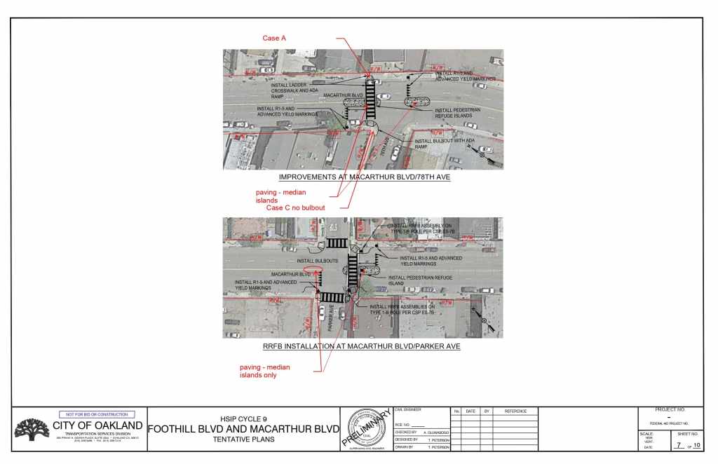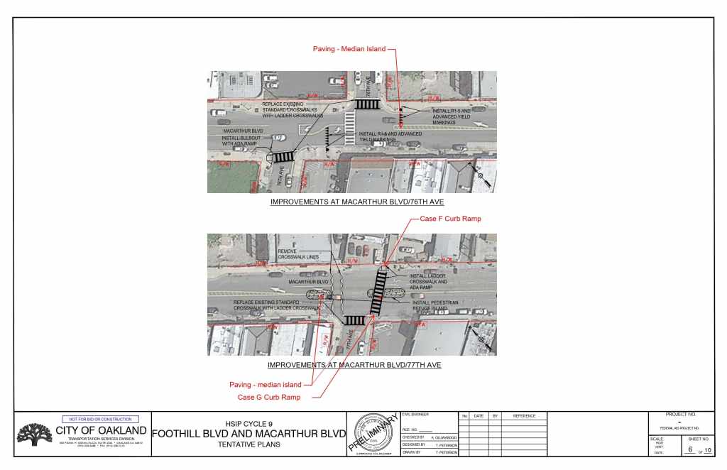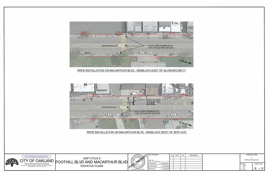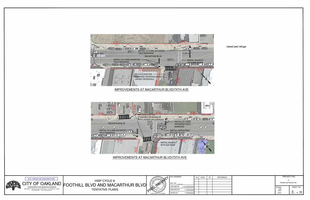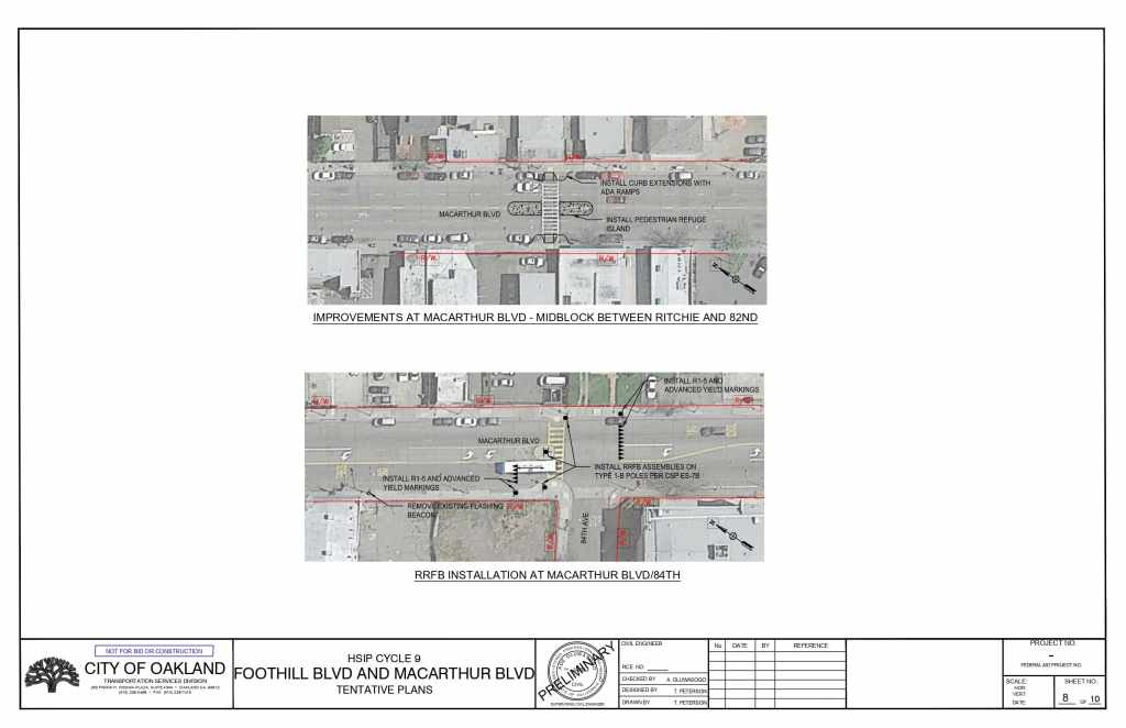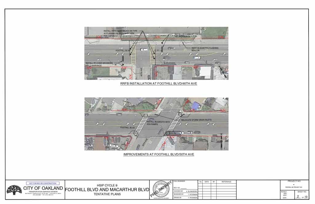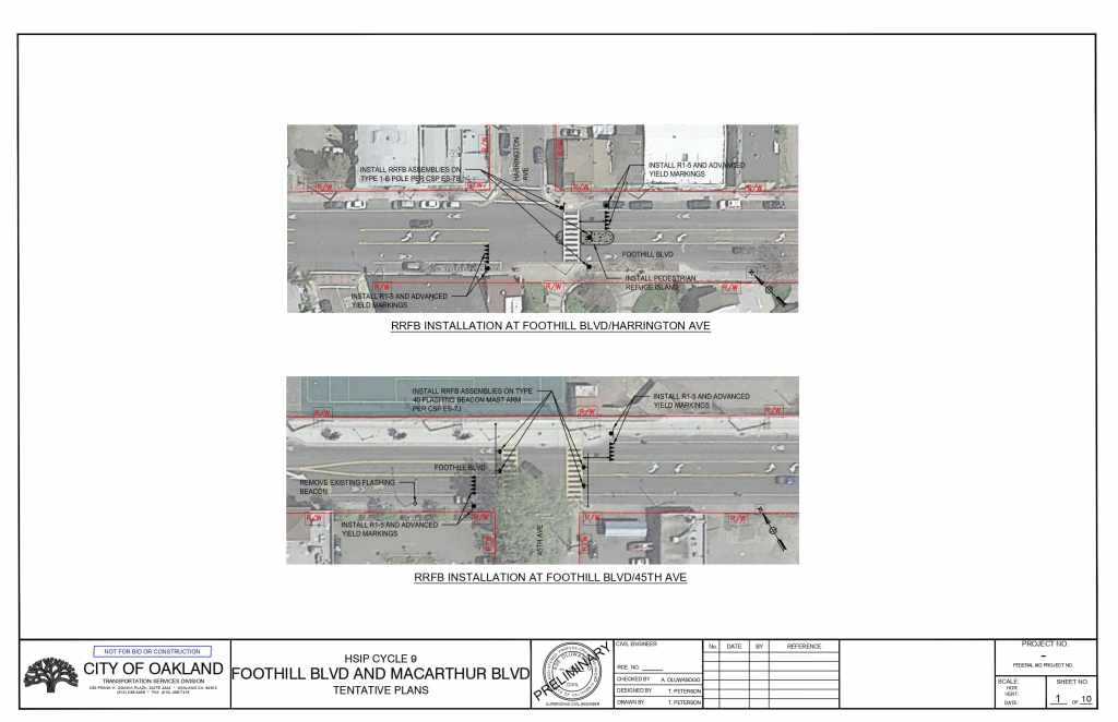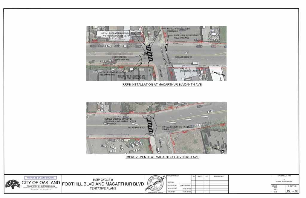 The plans propose installing high-visibility crosswalks, pedestrian refuge islands, advance yield markings, and rectangular rapid flashing beacons (RRFB) at multiple intersections on Foothill Blvd and on MacArthur Blvd.