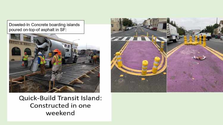 - Staff comment: The four materials are comparable in cost. They are most interested in concrete for its durability and for its aesthetics. OakDOT’s concrete crew has limited capacity, and it’s located in another division. The Traffic Maintenance Section within the Safe Streets Division has staff who are very capable at installing surface-mounted materials. So even though the cost is comparable, who can build it is a key factor for us in figuring out how to do this work in an efficient manner.