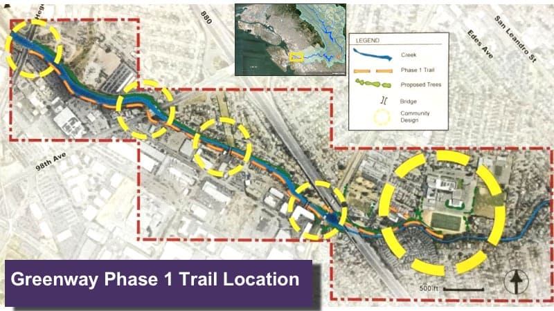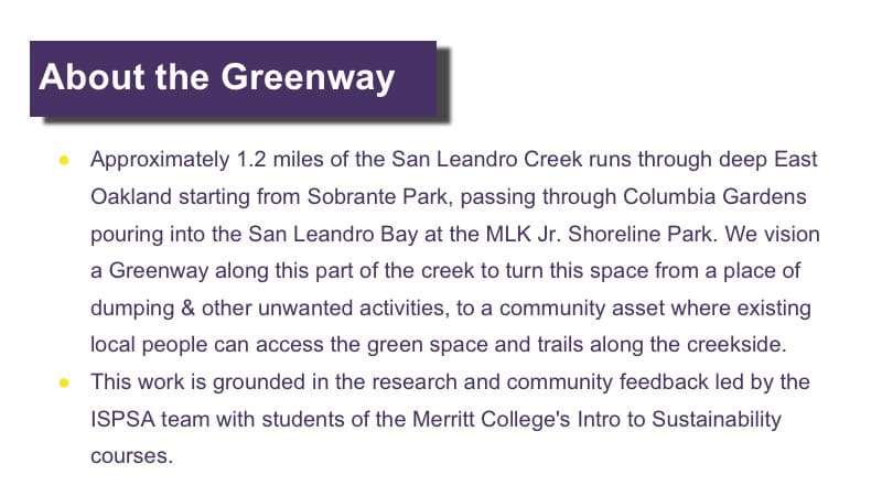 - Approximately 1.2 miles of the San Leandro Creek runs through Deep East Oakland starting from Sobrante Park, passing through Columbia Gardens pouring into the San Leandro Bay at the MLK Jr. Shoreline Park. We vision a Greenway along this part of the creek to turn this space from a place of dumping & other unwanted activities, to a community asset where existing local people can access the green space and trails along the creekside.