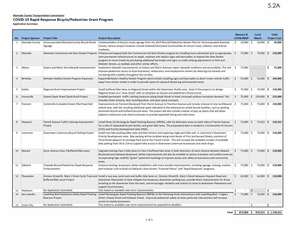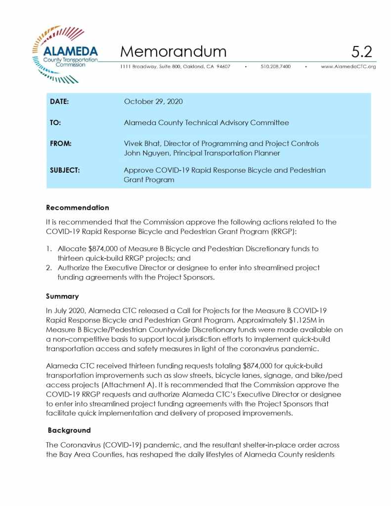 The City of Oakland applied to the grant program and its application was recommended to the Alameda County Technical Advisory Committee (ACTAC) on 29 October 2020.