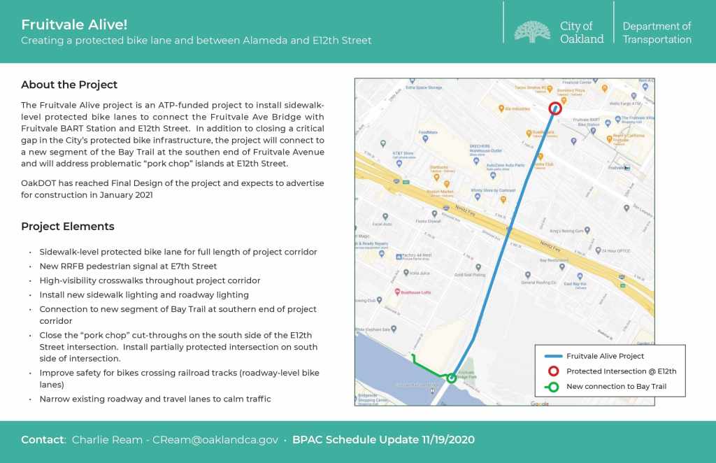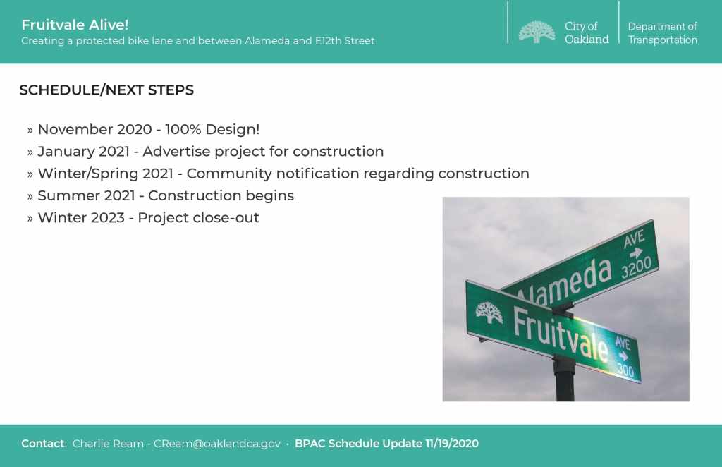 At the November 19, 2020 BPAC meeting, OakDOT Transportation Planner on the Great Streets Planning & Project Development Team, Charlie Ream, will be presenting on this project.