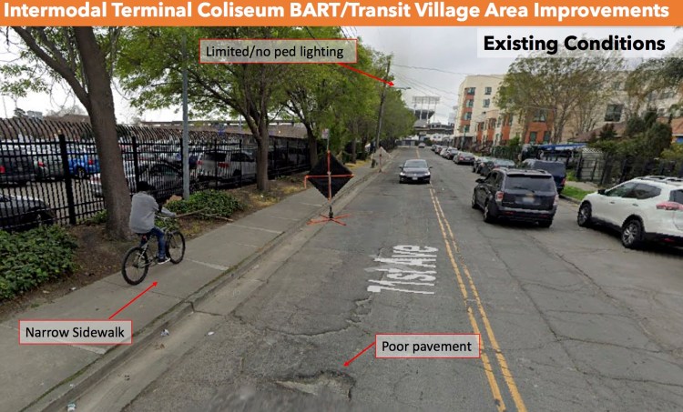 North of 42nd Ave is Oakland right-of-way, south of 42nd Ave is Caltrans. AC Transit project is almost entirely complete, so follow-up will likely need to be handled by others.