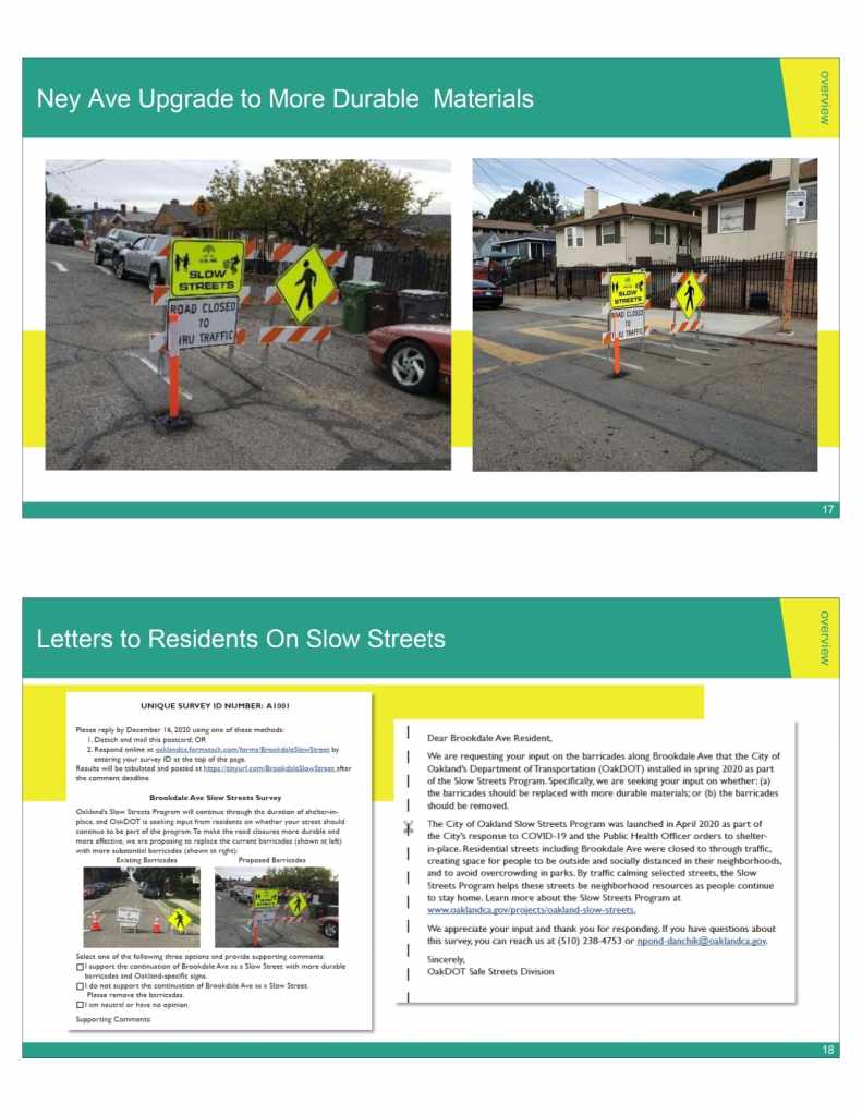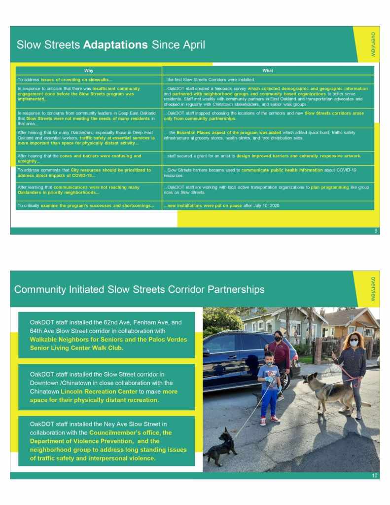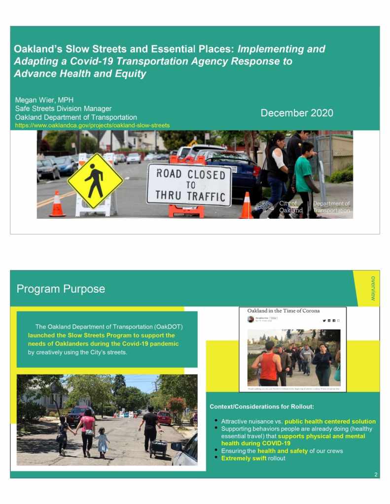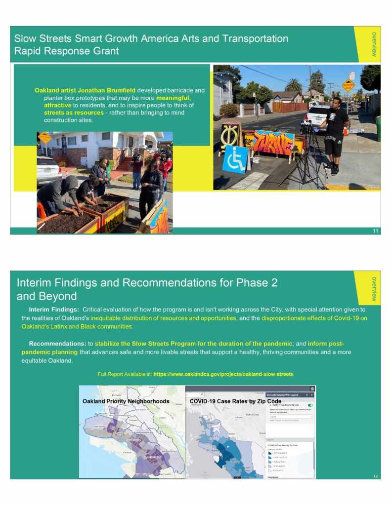 At the December 17, 2020 BPAC meeting, Megan Weir, OakDOT Safe Streets Division Manager, presented on the Slow Streets program including the Slow Streets Interim Findings Report and implementation of the recommendations since its release in September including more durable treatments, new signage, and corridor-level engagement on the future of the program. More information about the program, including the Interim Findings Report, is on the Slow Streets webpage.