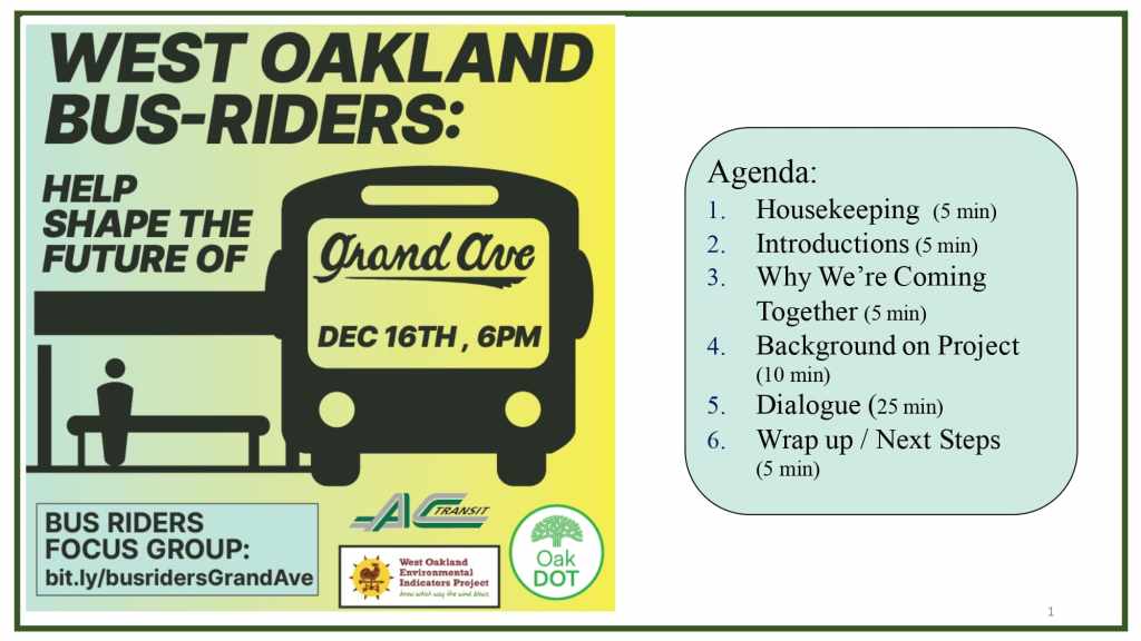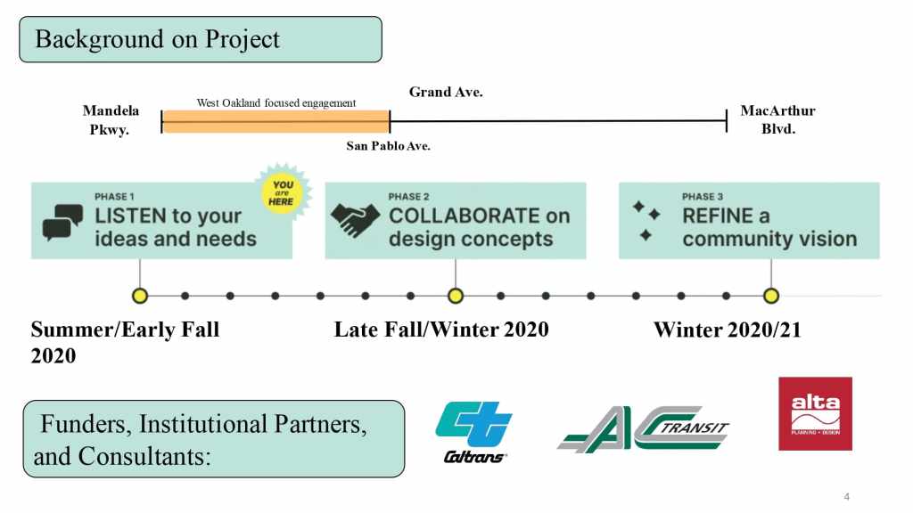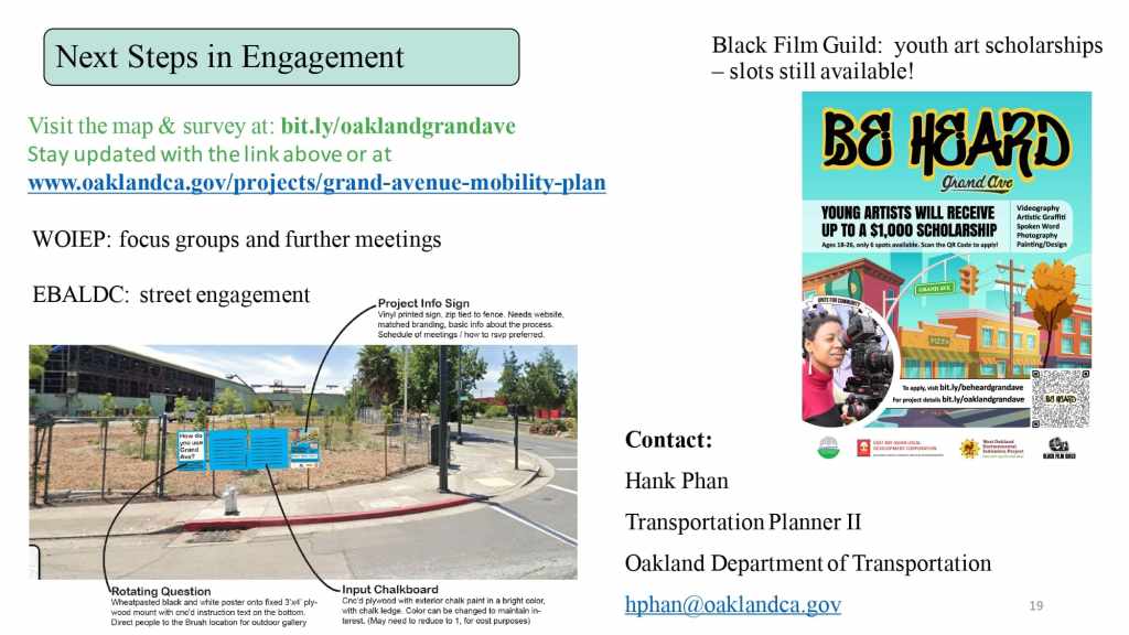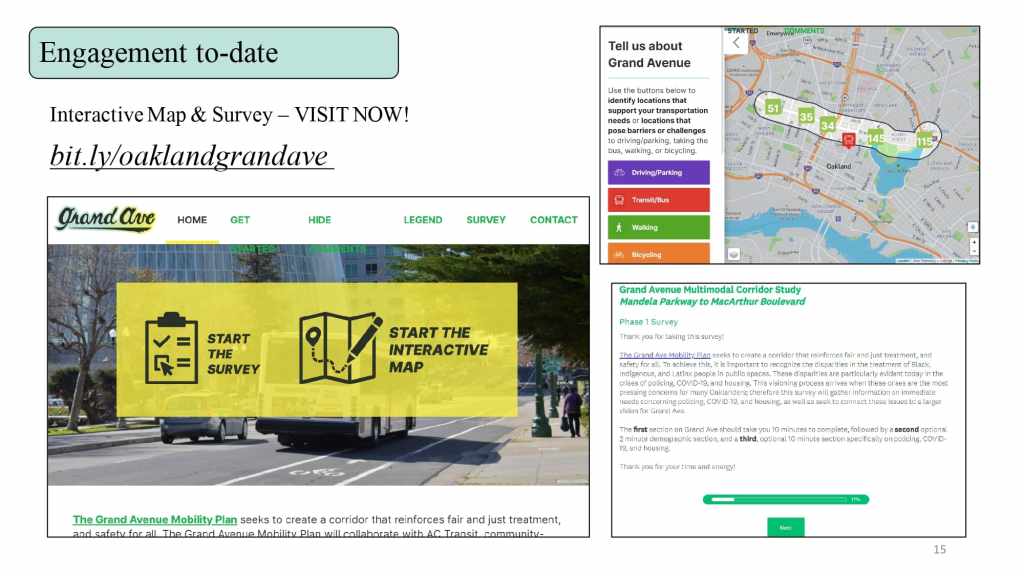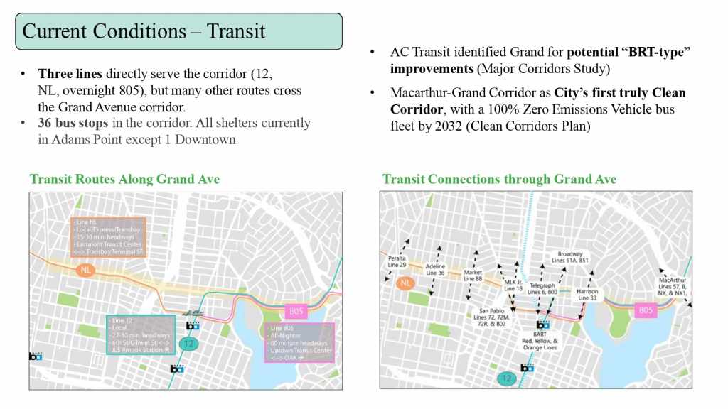 At the February 4th, 2021 BPAC Infrastructure Committee meeting, Hank Phan, OakDOT transportation planner, presented an update on the Grand Avenue Mobility Project. This is the presentation he gave to a focus group meeting with bus riders. View the project website and the survey with an interactive map.