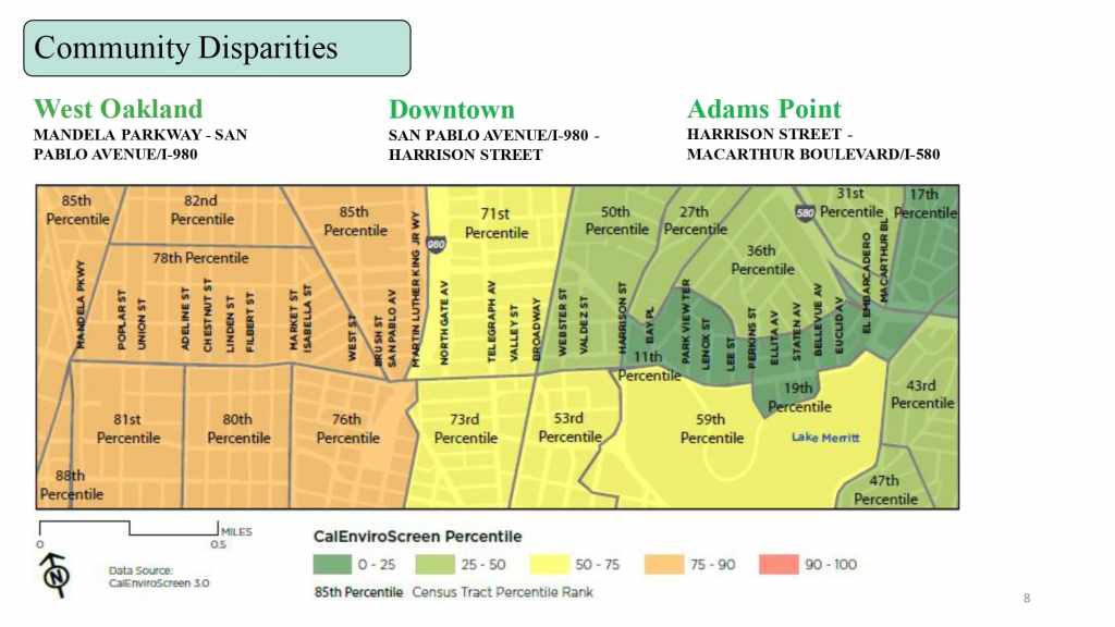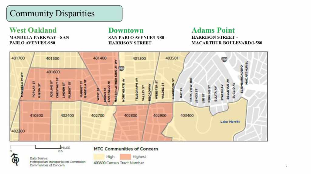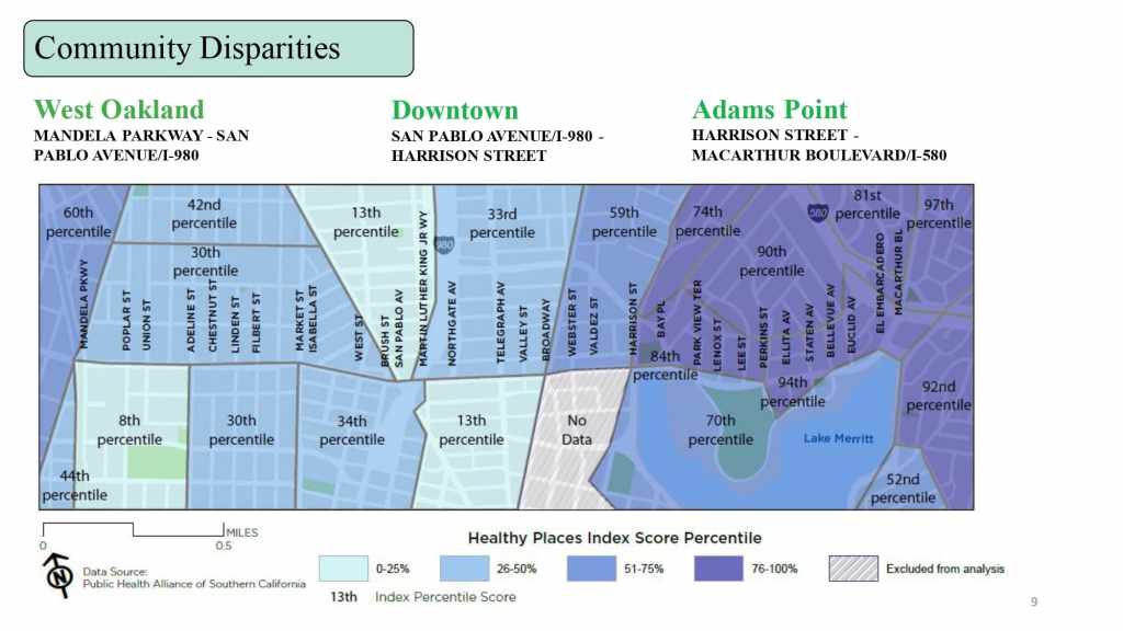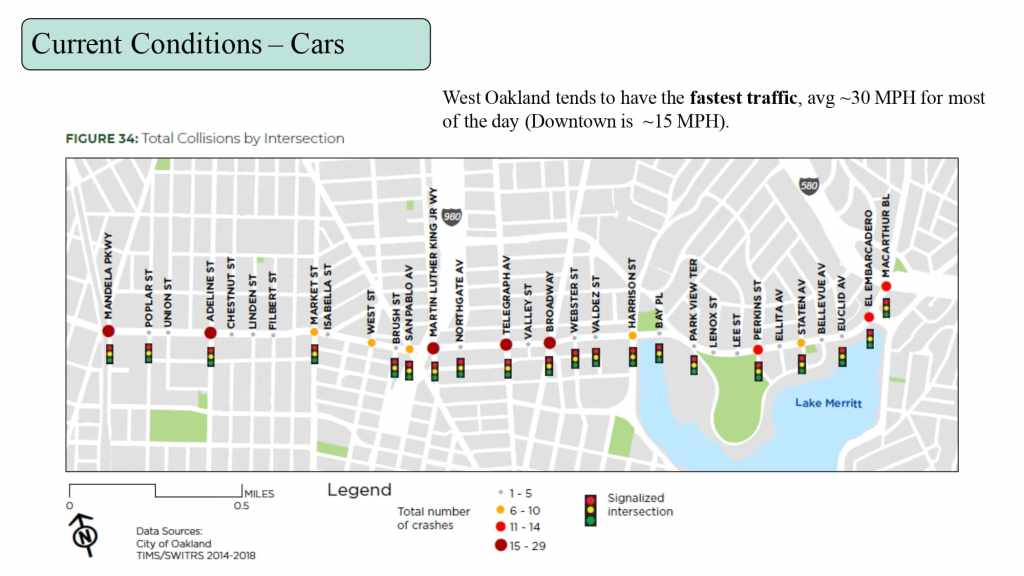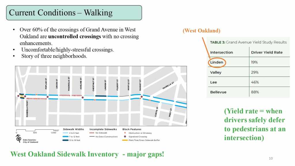 - West Oakland segment has some of the lowest level of infrastructure, like number of crosswalks. Driver yield rates to pedestrians were measured at each intersection. West Oakland was lowest. – Missing sidewalk segments were also identified.