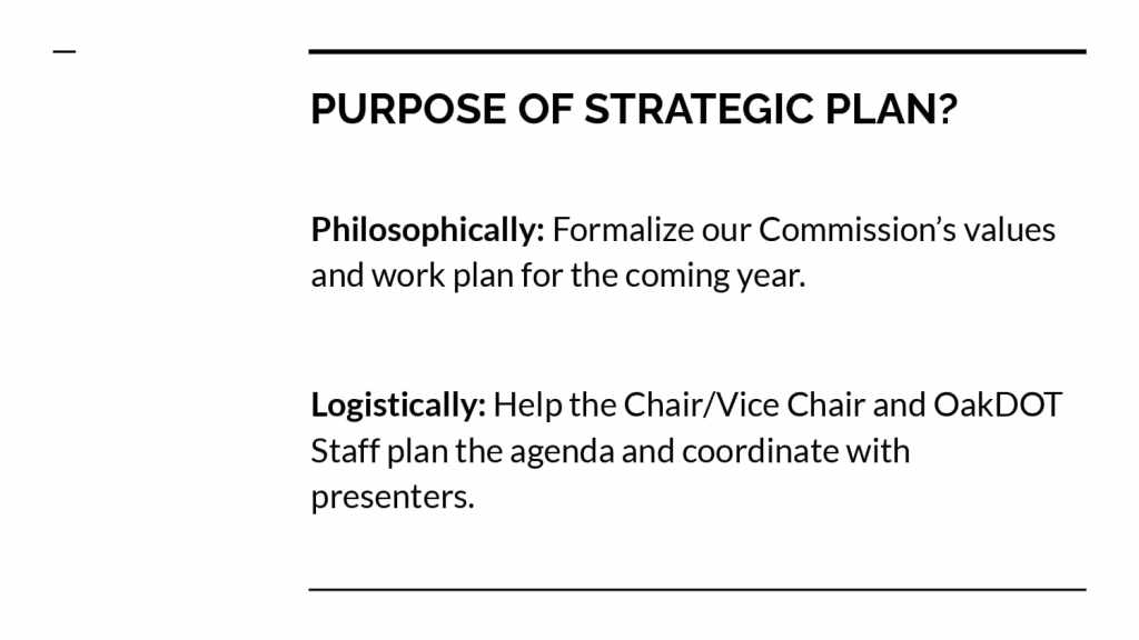 - Logistically: Help the Chair/Vice Chair and OakDOT Staff plan the agenda and coordinate with presenters.