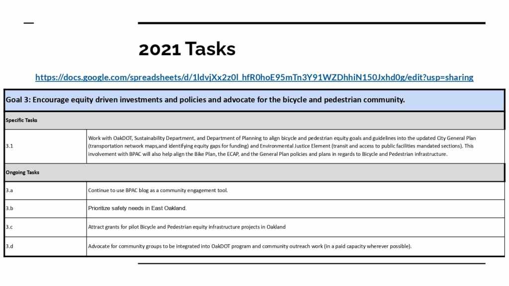 - Goal 3: Encourage equity driven investments and policies and advocate for the bicycle and pedestrian community.