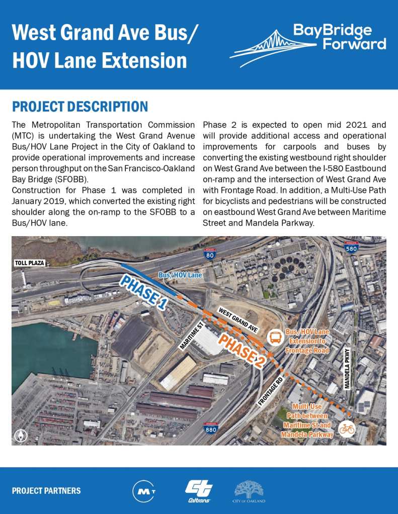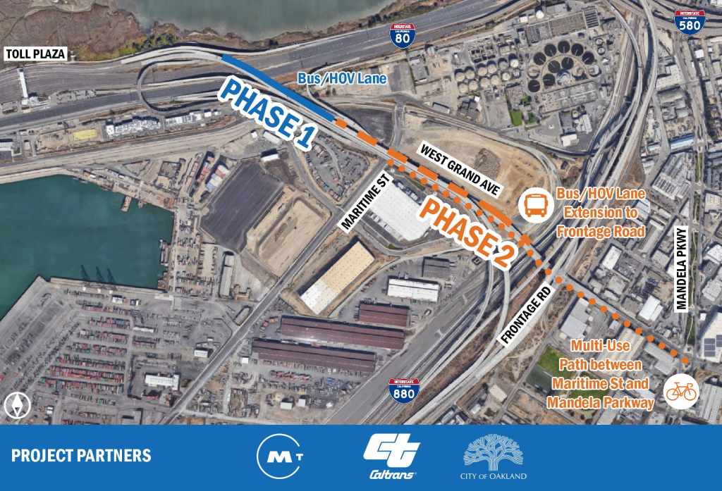 Phase 2 is expected to open mid-2021 and will provide additional access and operational improvements for carpools and buses by converting the existing westbound right shoulder on West Grand Ave between the I-580 eastbound on-ramp and the intersection of West Grand Ave with Frontage Road. In addition, a multi-use path for bicyclists and pedestrians will be constructed on eastbound West Grand Ave between Maritime Street and Mandela Parkway.