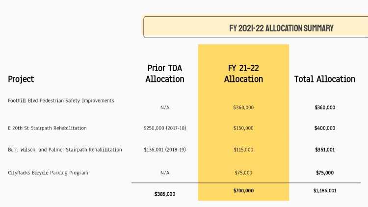 At the April 15, 2021 BPAC meeting, Julieth Ortiz, OakDOT Transportation Planner, presented an overview of existing Transportation Development Act (TDA) Article 3 projects and a draft project list for fiscal year 2021-22. This year’s recommendation is to use funding for existing programs/projects, including the bicycle parking program, the stairs and path program, and Foothill pedestrian safety improvements. Input from the Commission regarding priorities is welcome.