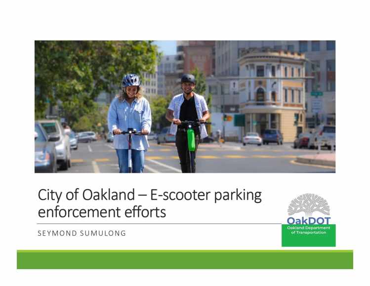 At the May 20, 2021 BPAC meeting, Kerby Olsen, New Mobility Supervisor, gave a quick update on the E-scooter program and introduced two of the three new permitted operators: SPIN, VeoRide and LINK. Seymond Sumulong, Construction Inspector, gave an update on E-scooter parking enforcement and the effectiveness of the locking requirement.