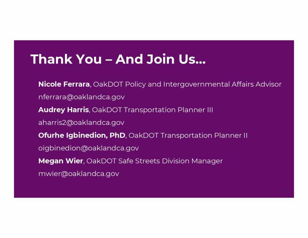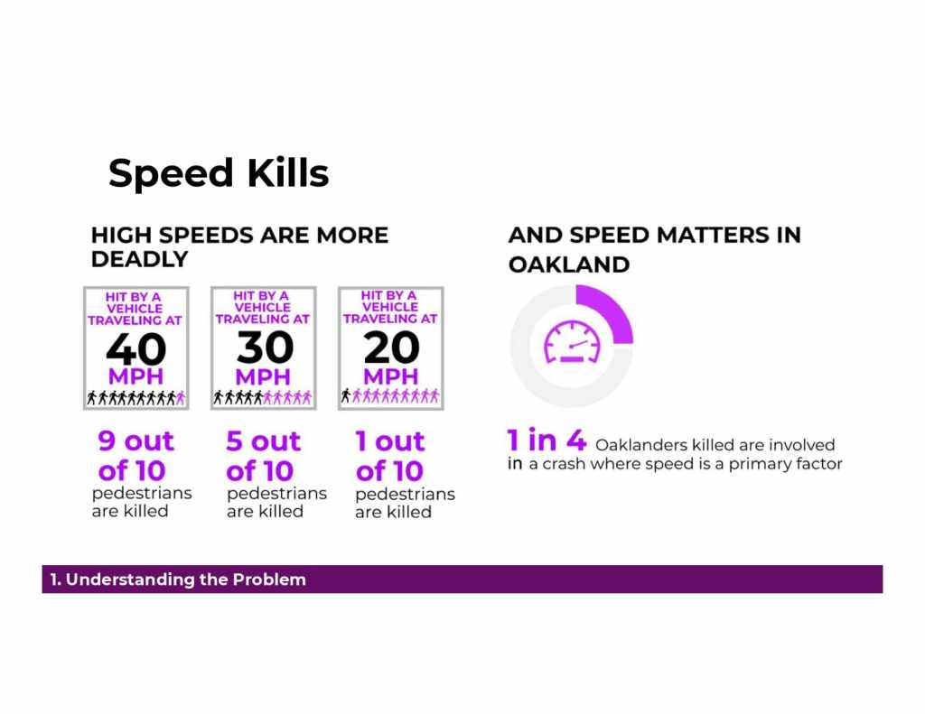 At the May 20, 2021 BPAC meeting, Nicole Ferrara, OakDOT’s Policy & Intergovernmental Affairs Advisor, presented on and shared ways the BPAC can support two bills aimed at reducing dangerous speeding on California roadways that the State Legislature is considering: Assembly Bill AB 43 (Friedman): Speed Limit Setting, and AB 550 (Chiu): Speed Safety Systems. Both bills would implement Safe Oakland Streets (SOS) strategies, and the bills have been supported by City Council and the Mayor.