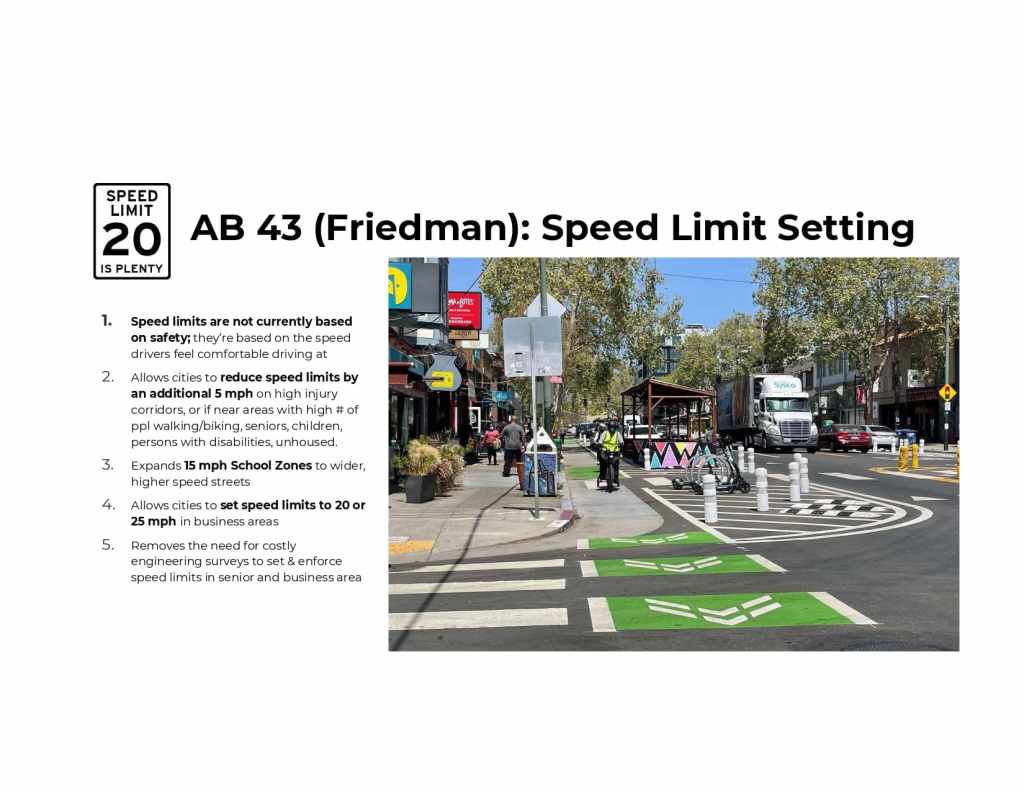 - AB 43 allows cities to set speed limits to 20 or 25 mph in business areas