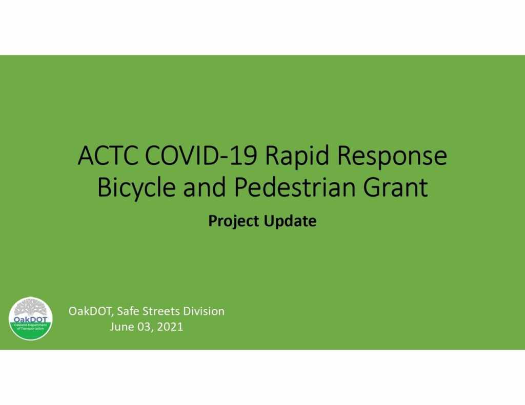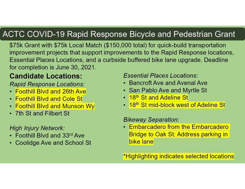 At the June 3rd, 2021 BPAC Infrastructure Committee meeting, OakDOT staff Jason Patton and Jason Cook gave a presentation on the ACTC Rapid Response Projects and led a discussion to follow up on these projects. Notes from the presentation and discussion are below.