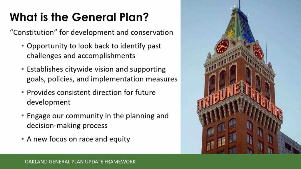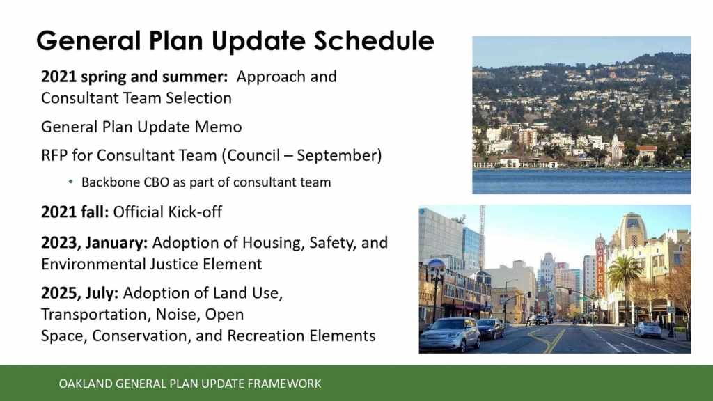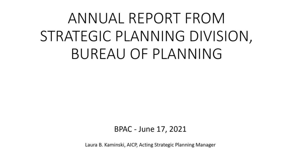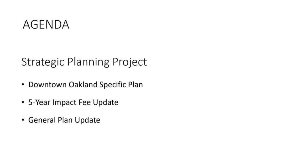 At the June 17, 2021 BPAC meeting, Laura Kaminski, Acting Strategic Planning Manager, gave an update on existing and new projects including: the Downtown Oakland Specific Plan, an Impact Fee Update, and a General Plan Update. The full presentation is below.