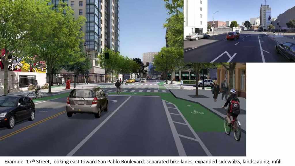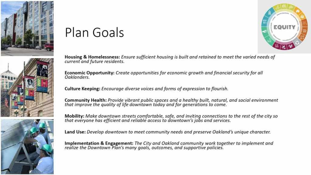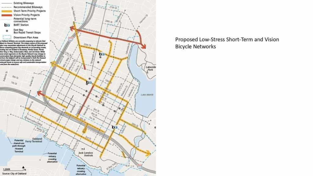 - The Downtown Oakland Specific Plan includes bicyclist and pedestrian recommendations in the downtown area (relevant to one of tonight’s comments during Open Forum).