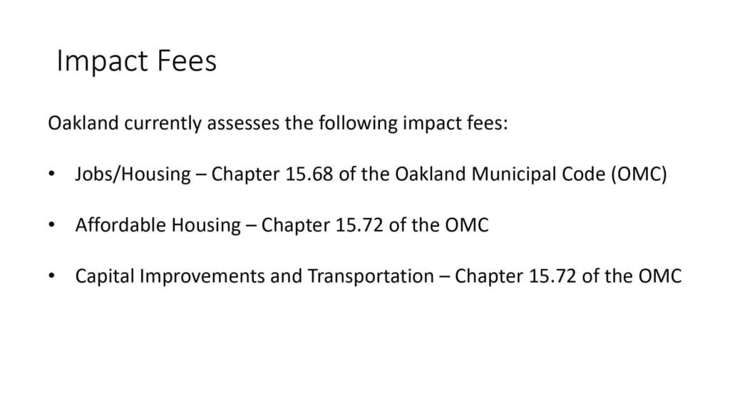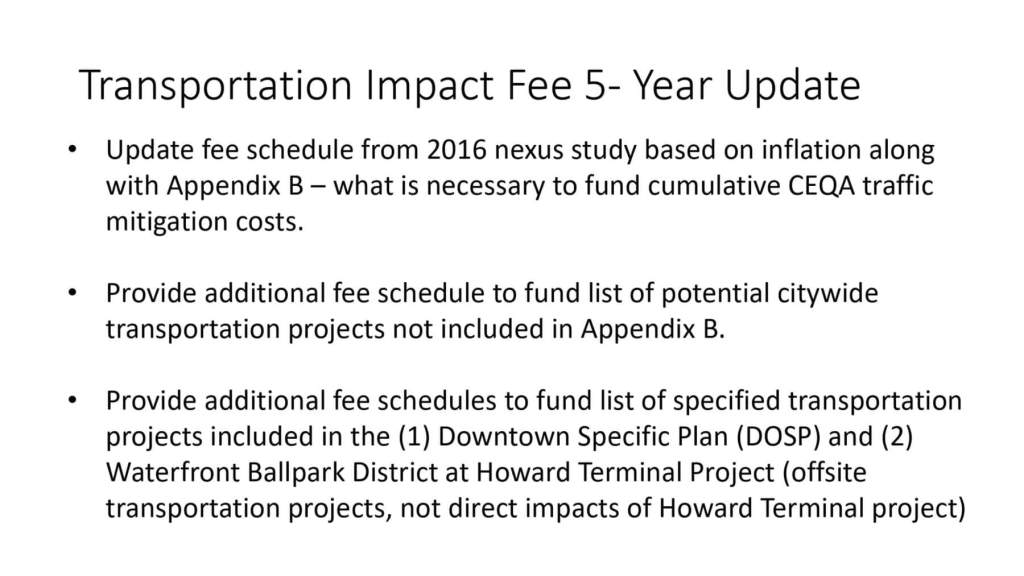 - Provide additional fee schedules to fund list of specified transportation projects included in the (1) Downtown Specific Plan (DOSP) and (2) Waterfront Ballpark District at Howard Terminal Project (offsite transportation projects, not direct impacts of Howard Terminal project)