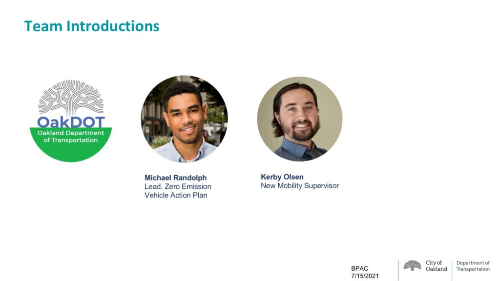 At the July 17, 2021 BPAC meeting, Kerby Olsen, New Mobility Supervisor at OakDOT, introduced the Zero Emission Vehicle (ZEV) Action Plan and the upcoming Electric Bike Library. Topics explored in the ZEV Plan include the installation of electric vehicle chargers in the public right of way, increasing access to ebikes and e-scooters, and encouraging cargo bike delivery services. The Electric Bike Library is a grant-funded, $1,000,000 project to purchase 1,000 electric bicycles and make them available for medium- or long- term rental at low cost through existing bike shops and bike programs.
