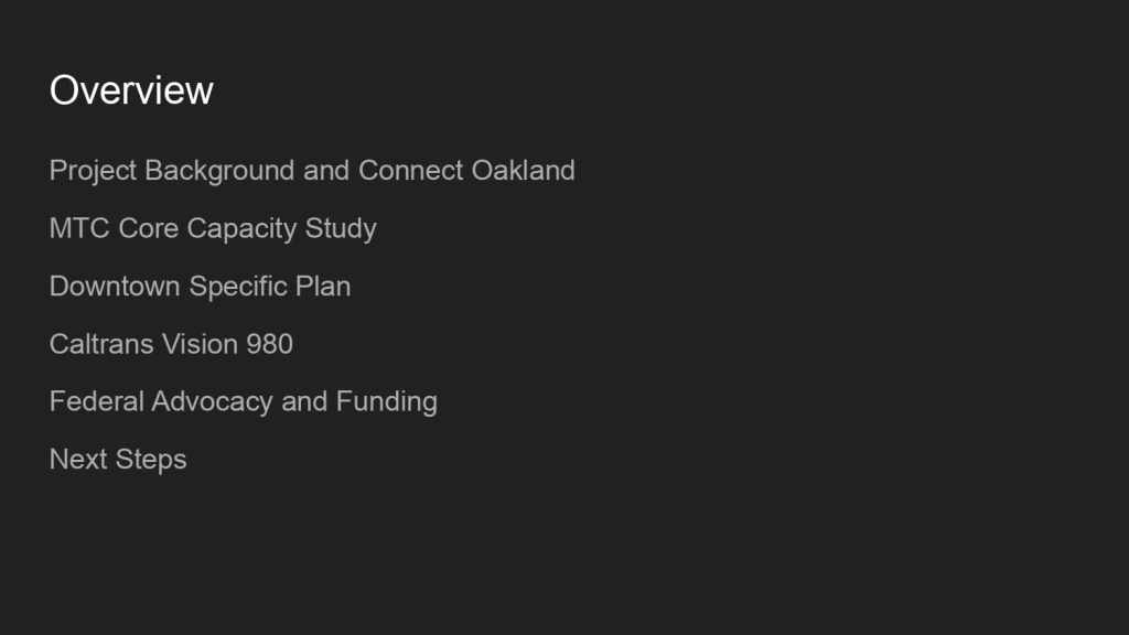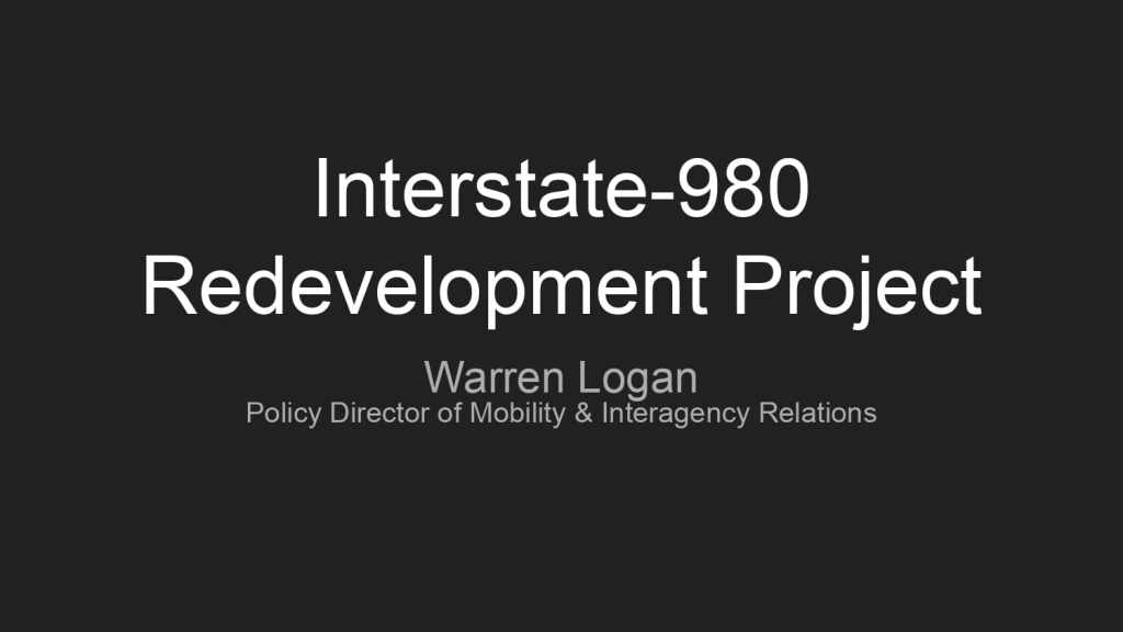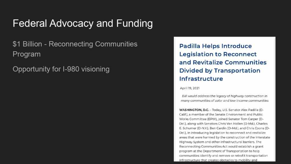 At the August 19, 2021 BPAC meeting, Warren Logan, Policy Director of Mobility and Interagency Relations, gave a presentation on the potential redevelopment project to remove/cap Interstate-980. The Mayor’s Office has completed a partnership study with the Urban Leaders Fellowship program to develop an equitable engagement strategy. The Mayor’s Office and the Oakland DOT plan to meet with Caltrans District 4 project managers to identify ways to align with the State DOT’s ‘Vision 980’ project which will develop right of way concepts and alternatives for Interstate-980. Lastly, Warren shared details about the Mayor’s Office’s State and Federal advocacy for programming grant funds for the I-980 redevelopment and affordable housing.
