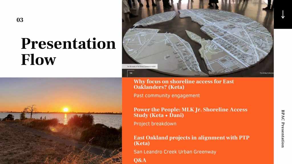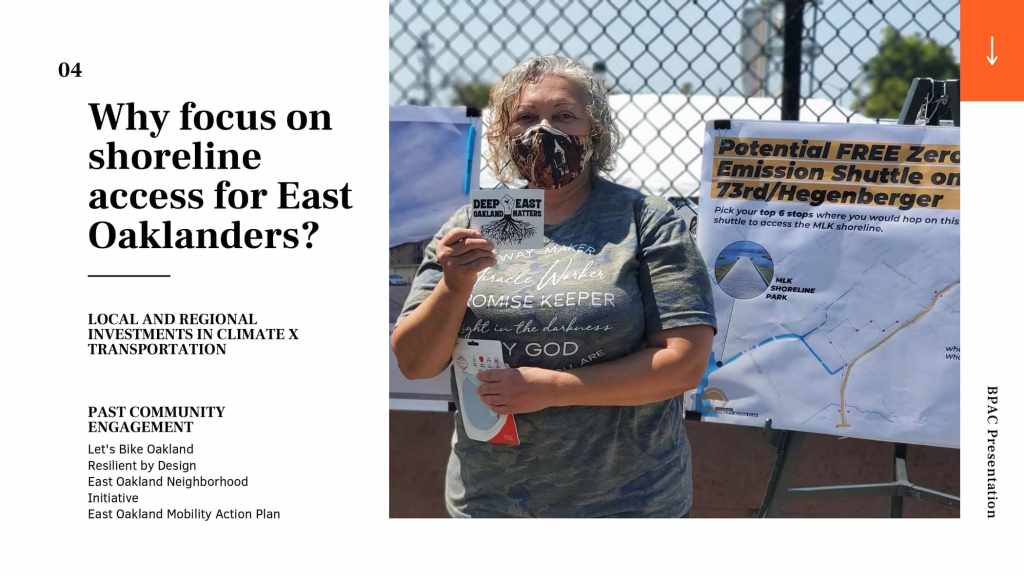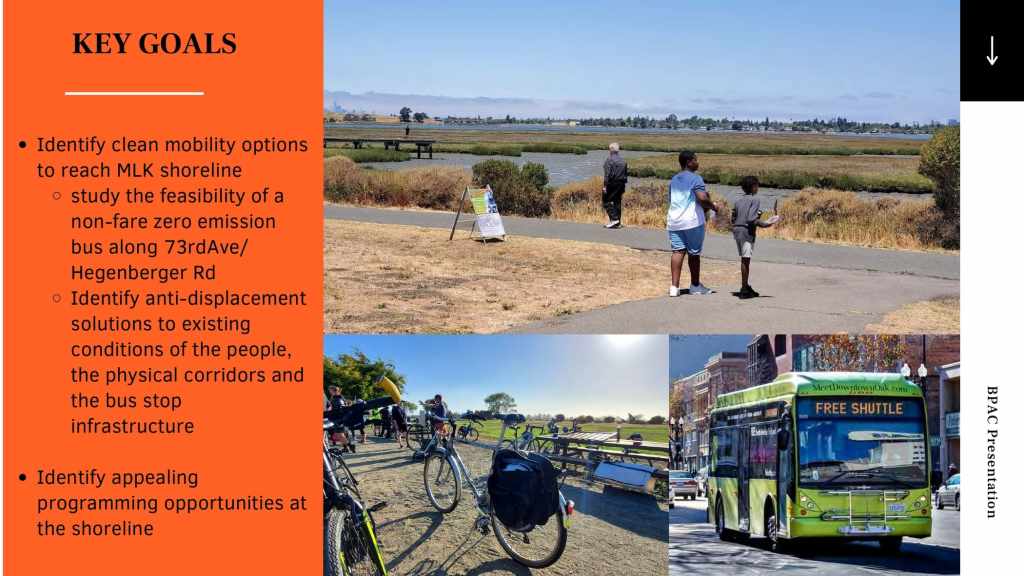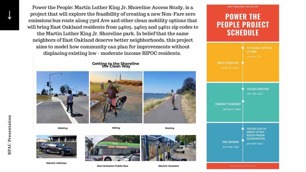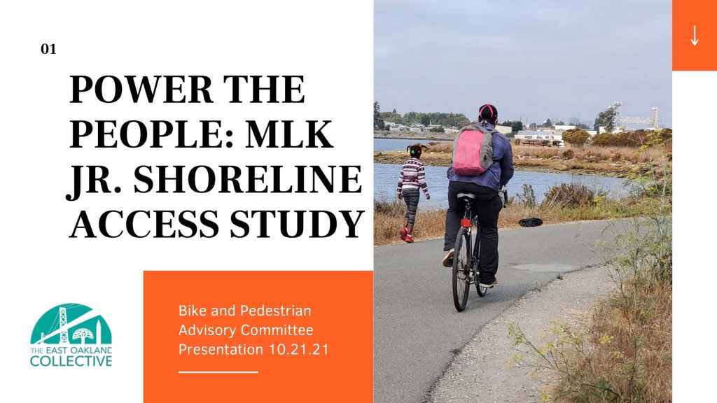 At the October 21, 2021 BPAC meeting, Marquita Price, Director of Urban & Regional Planning and Danielle Dynes, Neighborhood and Transportation Planner, at the East Oakland Collective (EOC), gave a presentation describing EOC’s focus on shoreline access by highlighting the new Power the People: MLK Jr. Shoreline Access Study, which aims to explore feasible clean mobility options that can connect East Oakland residents to the MLK Jr. Shoreline. The full presentation is below.