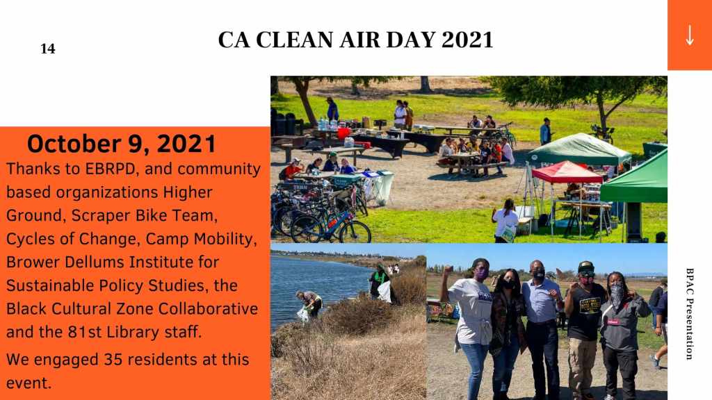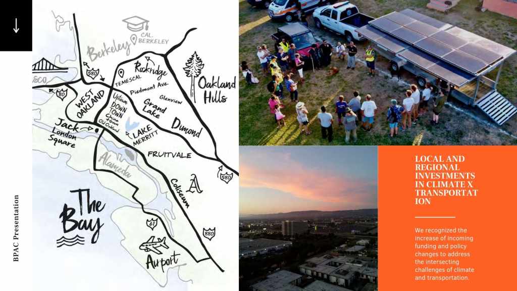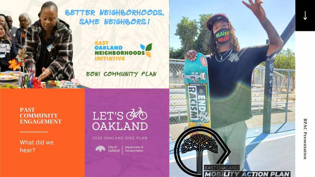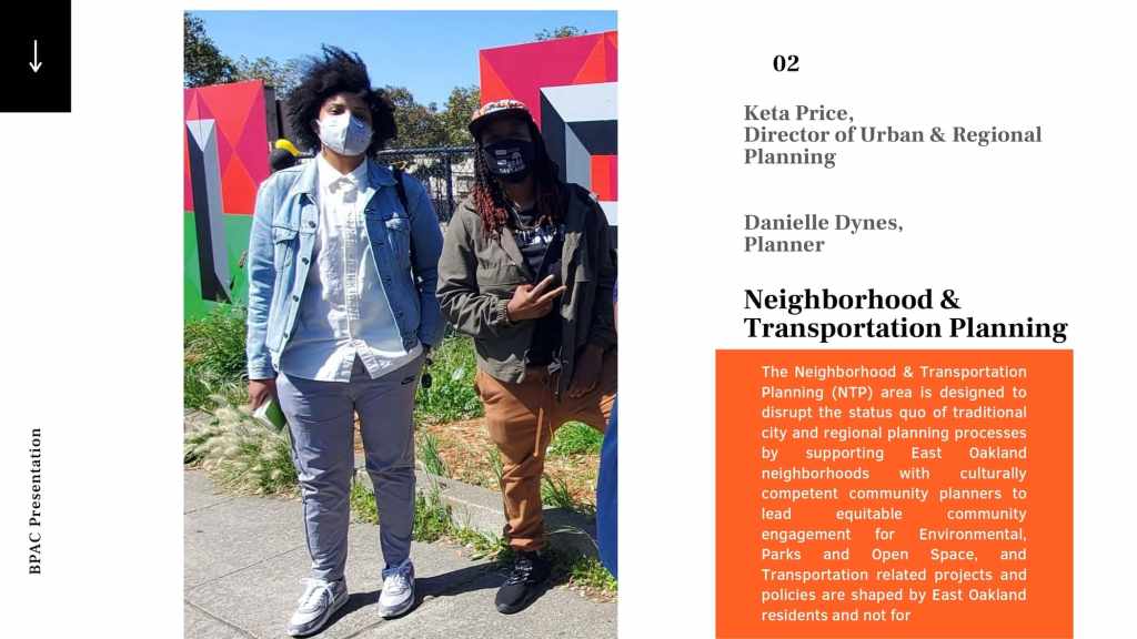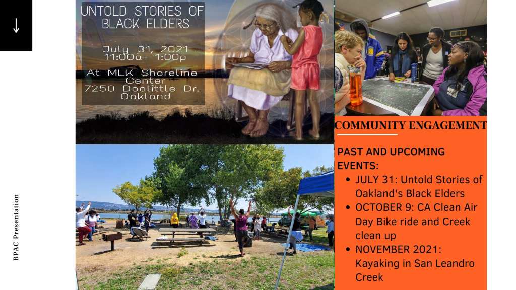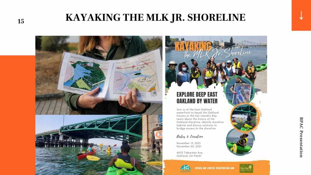 At the October 21, 2021 BPAC meeting, Marquita Price, Director of Urban & Regional Planning and Danielle Dynes, Neighborhood and Transportation Planner, at the East Oakland Collective (EOC), gave a presentation describing EOC’s focus on shoreline access by highlighting the new Power the People: MLK Jr. Shoreline Access Study, which aims to explore feasible clean mobility options that can connect East Oakland residents to the MLK Jr. Shoreline. The full presentation is below.