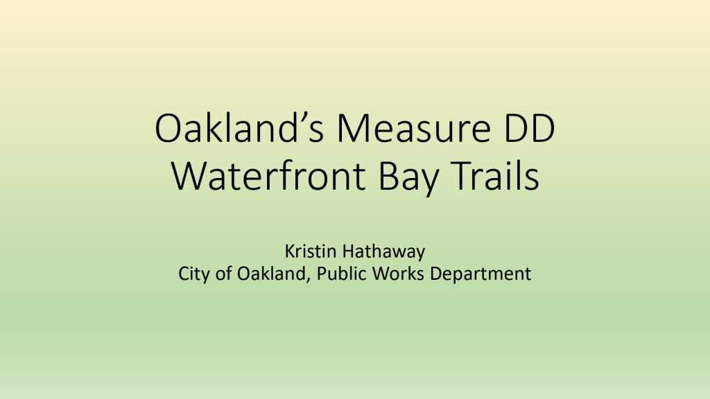 At the December 16, 2021 BPAC meeting, Kristin Hathaway, Watershed and Stormwater Division and Measure DD Program Manager (Public Works Department), will present on the status of the Oakland Waterfront Trail.