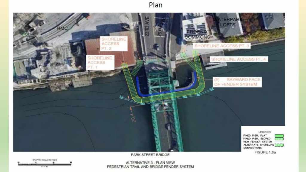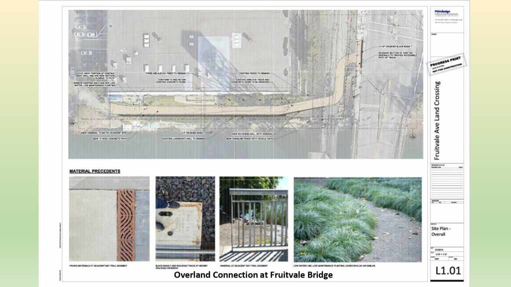- The proposal at the High St Bridge is for an “over-the-water” trail which is believed to provide a better connection. In contrast, at Fruitvale Ave, the trail will cross at street-level at the Fruitvale Ave/Alameda Ave intersection.