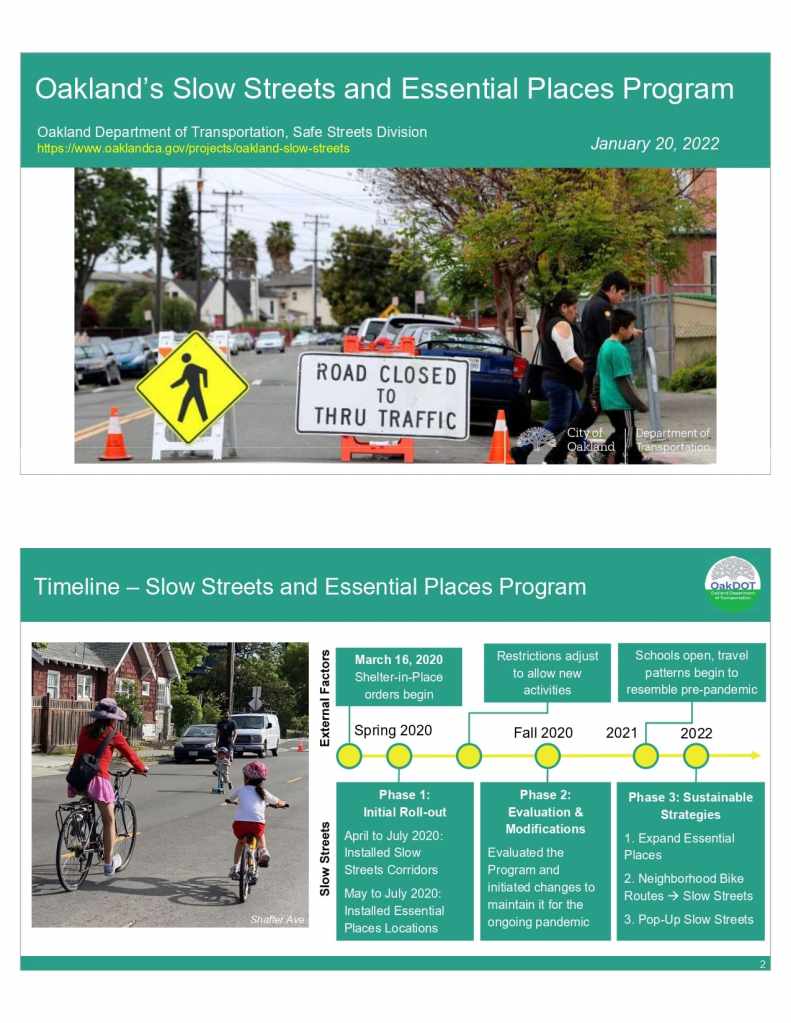At the January 20, 2022 BPAC meeting, Megan Wier and Jason Patton, OakDOT staff in the Safe Streets Division, will present on upcoming changes to the Slow Streets–Essential Places Program in response to the ongoing and changing nature of the COVID-19 pandemic. Changes include removing the temporary Slow Streets and Essential Places materials, including temporary street closures, and shifting efforts to longer term strategies for pedestrian safety and neighborhood traffic calming. The presentation is below.