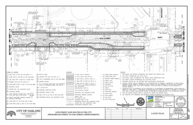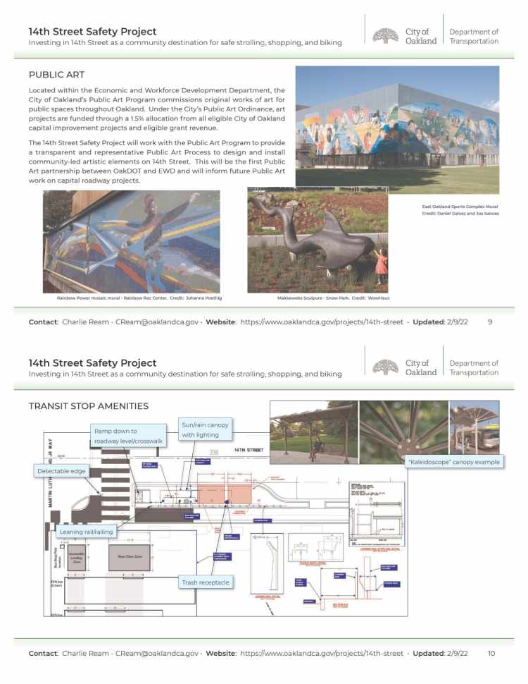 At the February 17, 2022 BPAC meeting, OakDOT Transportation Planner Charlie Ream presented on the 14th Street Safety Project. The project is proceeding toward 100% design in early 2022, with construction potentially beginning in early 2023. This roadway safety project will install protected bike lanes on 14th Street from Brush Street to Oak Street, take 14th Street from 4 to 2 vehicle lanes, shorten pedestrian crossings, and install new landscaping and sidewalk lighting. OakDOT is scheduled to bring the project to the Public Works Committee on 3/22/22 (date tentative).