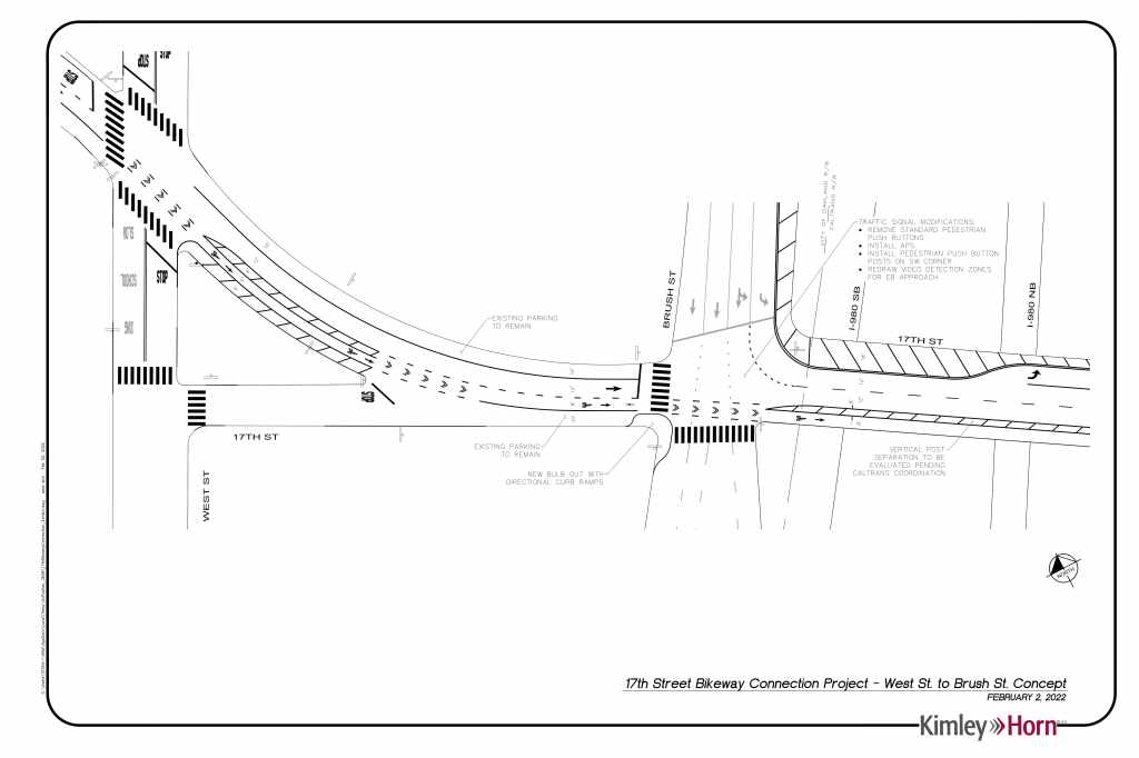 At the February 3, 2022 Infrastructure Committee meeting, Pablo Miras and Shirley Kwan gave a presentation on the concept plans for the 17th Street Bikeway Connection Project, which covers 17th Street in West Oakland from West Street to MLK Jr Way. The concept design [PDF] is below, followed by notes.