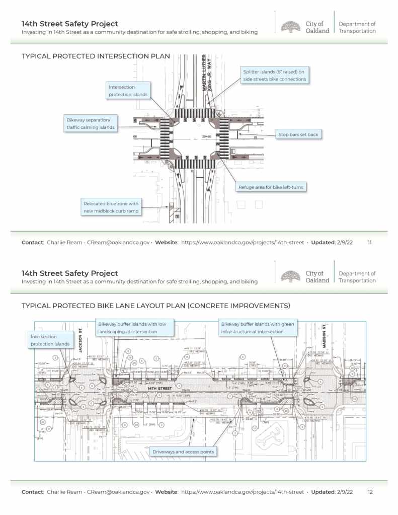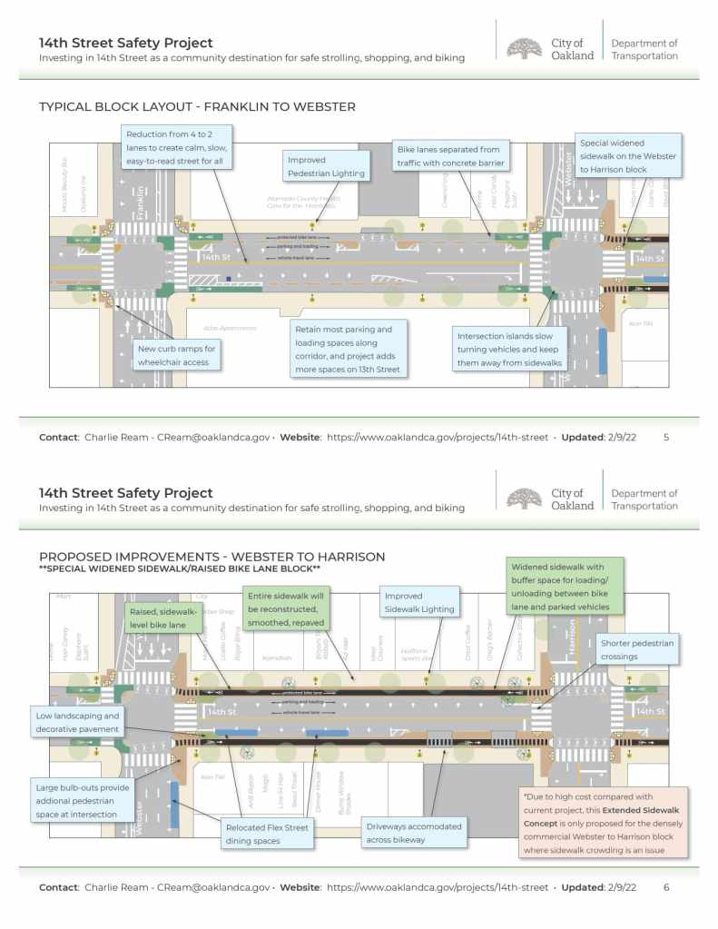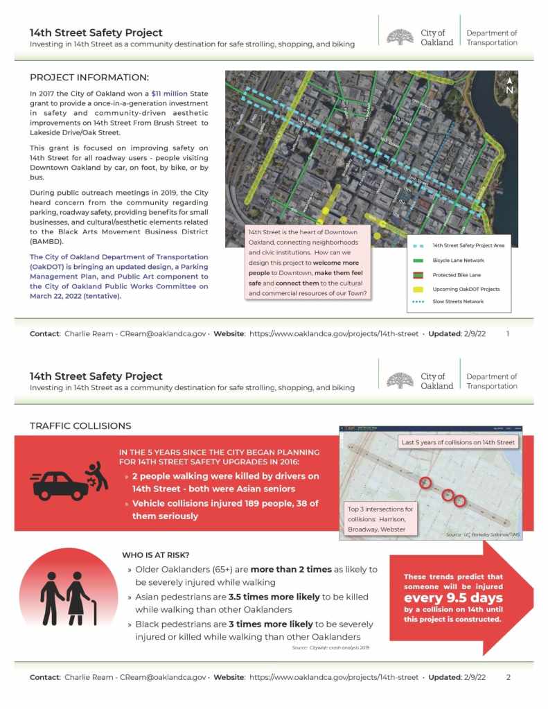 At the February 17, 2022 BPAC meeting, OakDOT Transportation Planner Charlie Ream presented on the 14th Street Safety Project. The project is proceeding toward 100% design in early 2022, with construction potentially beginning in early 2023. This roadway safety project will install protected bike lanes on 14th Street from Brush Street to Oak Street, take 14th Street from 4 to 2 vehicle lanes, shorten pedestrian crossings, and install new landscaping and sidewalk lighting. OakDOT is scheduled to bring the project to the Public Works Committee on 3/22/22 (date tentative).