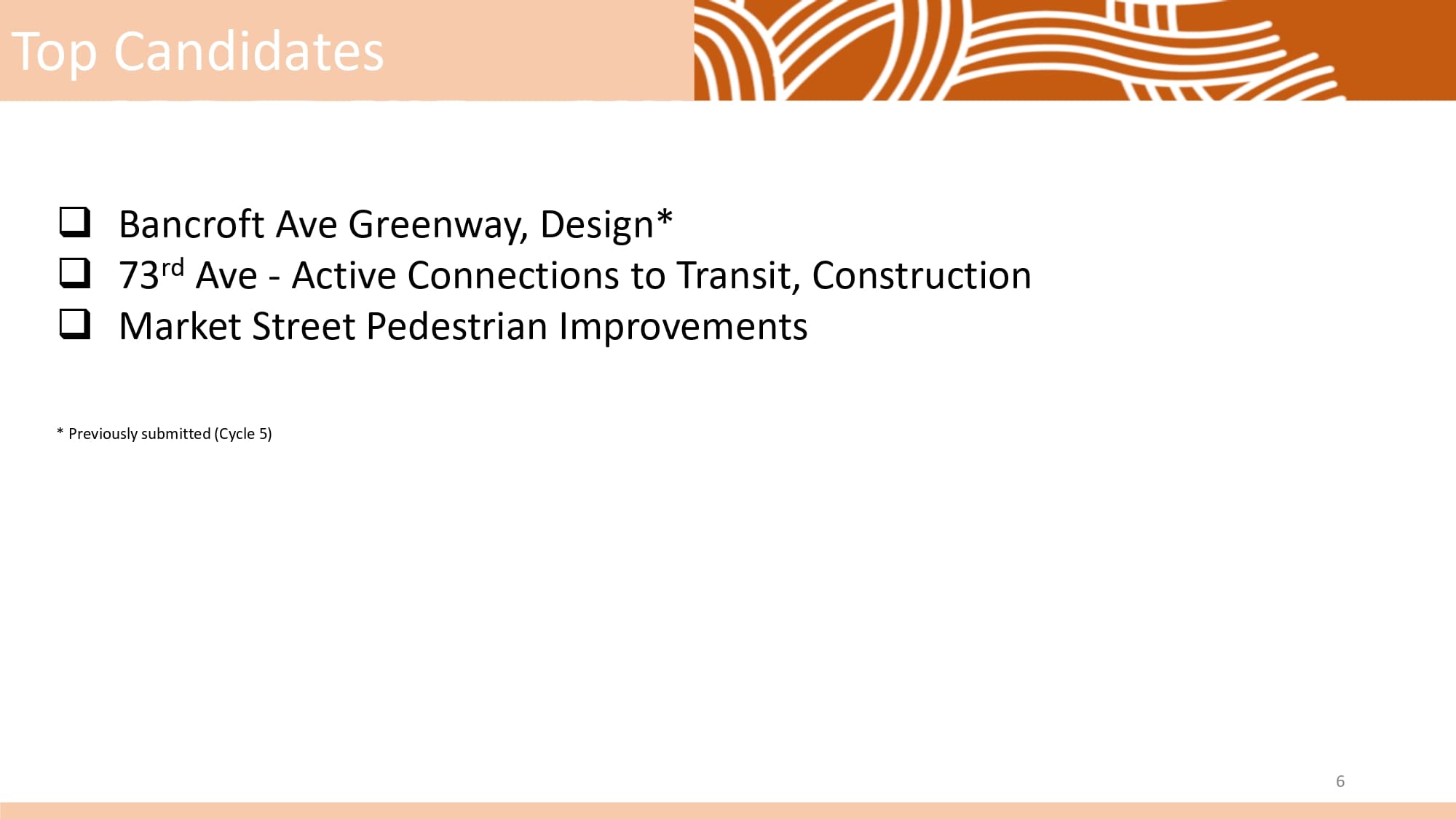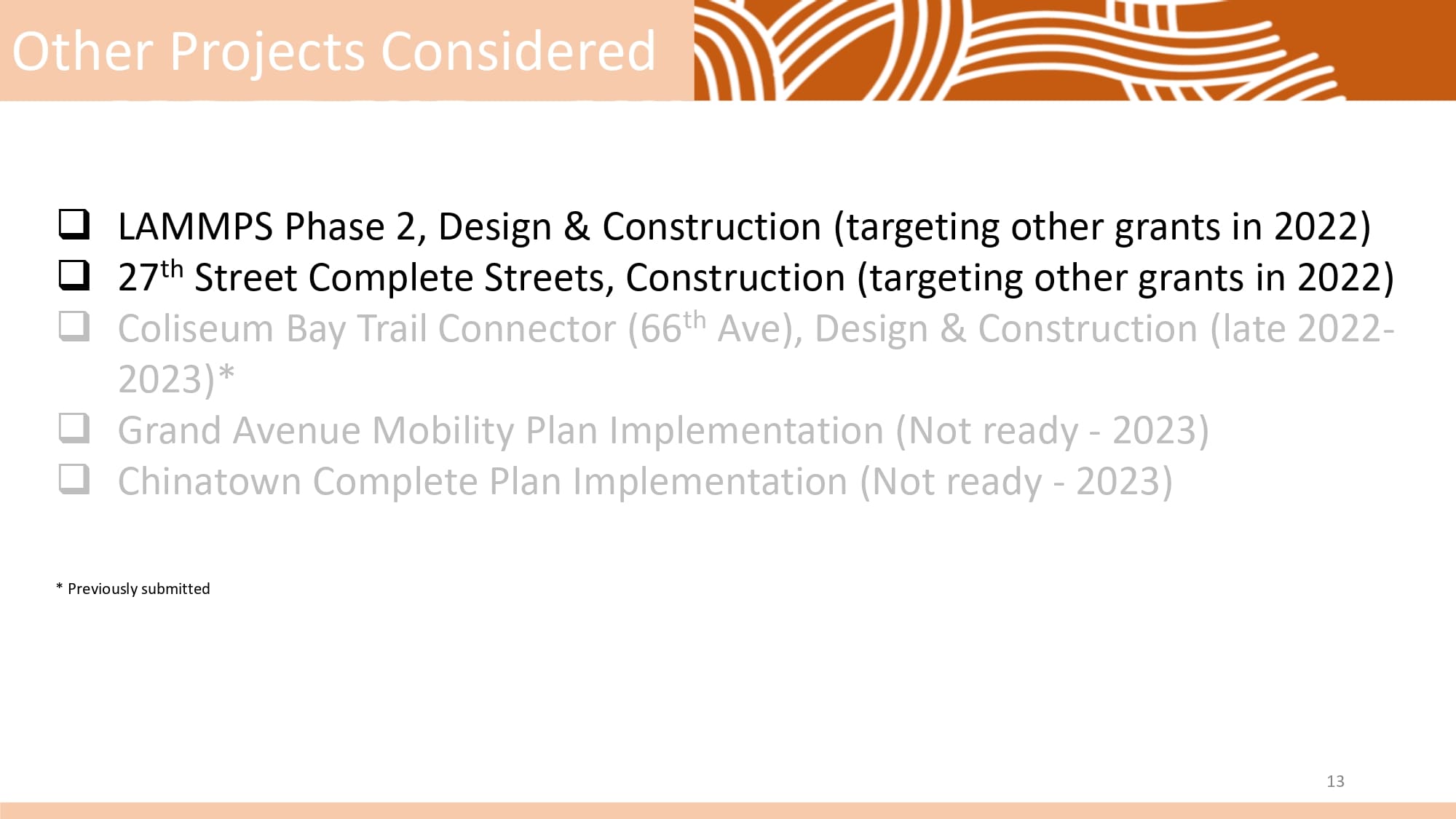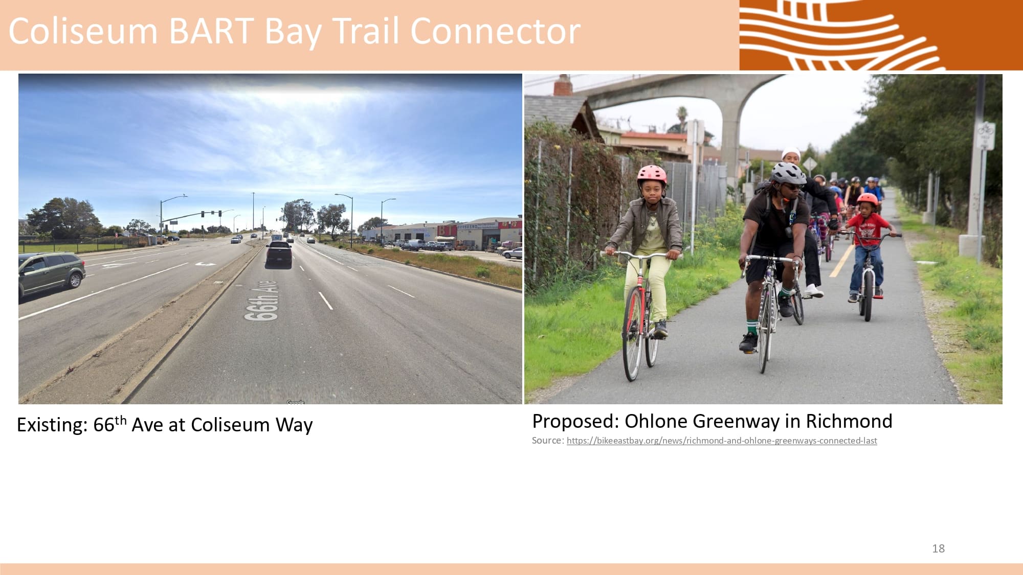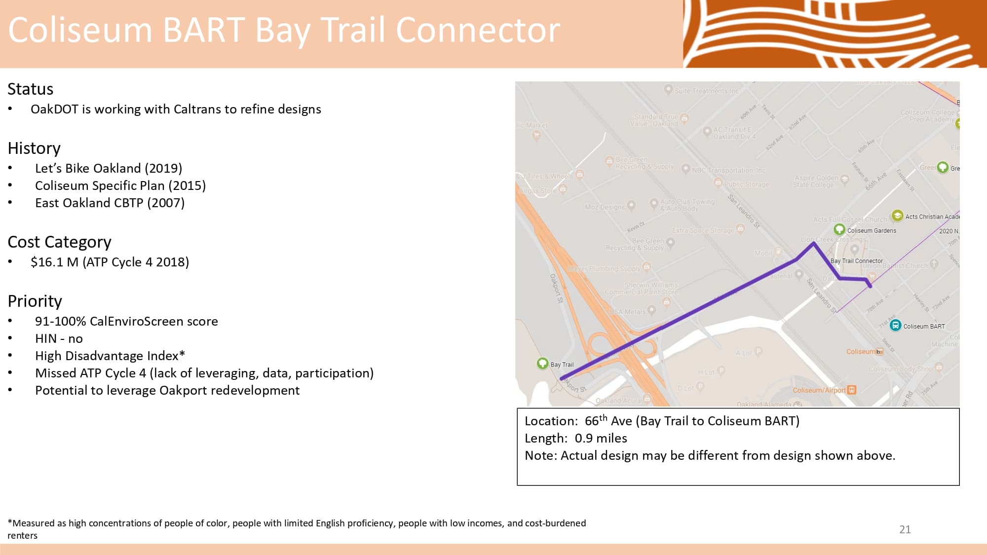 - Coliseum Bay Trail Connector (66th Ave), Design & Construction (previously submitted, ATP Cycle 4)