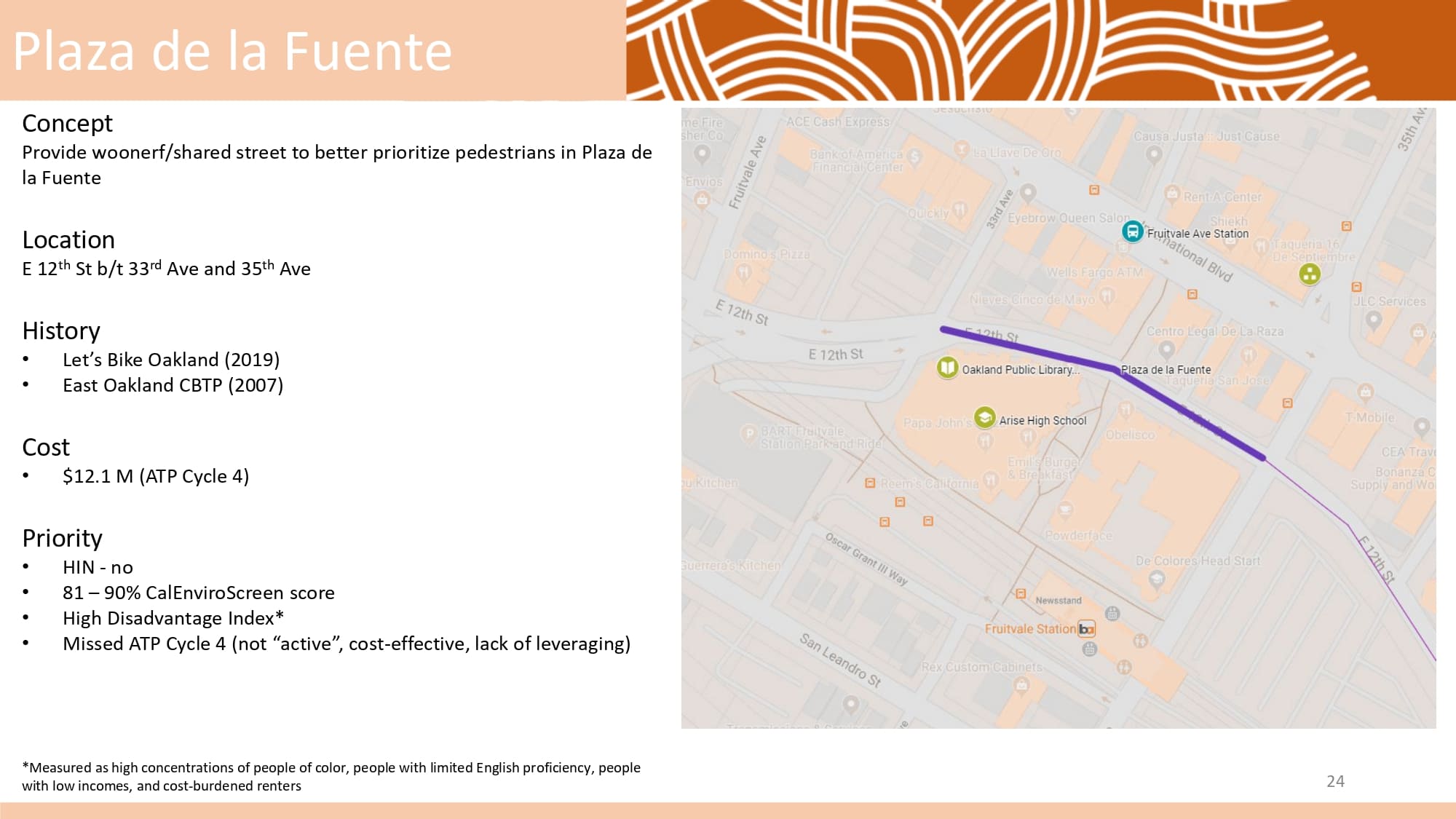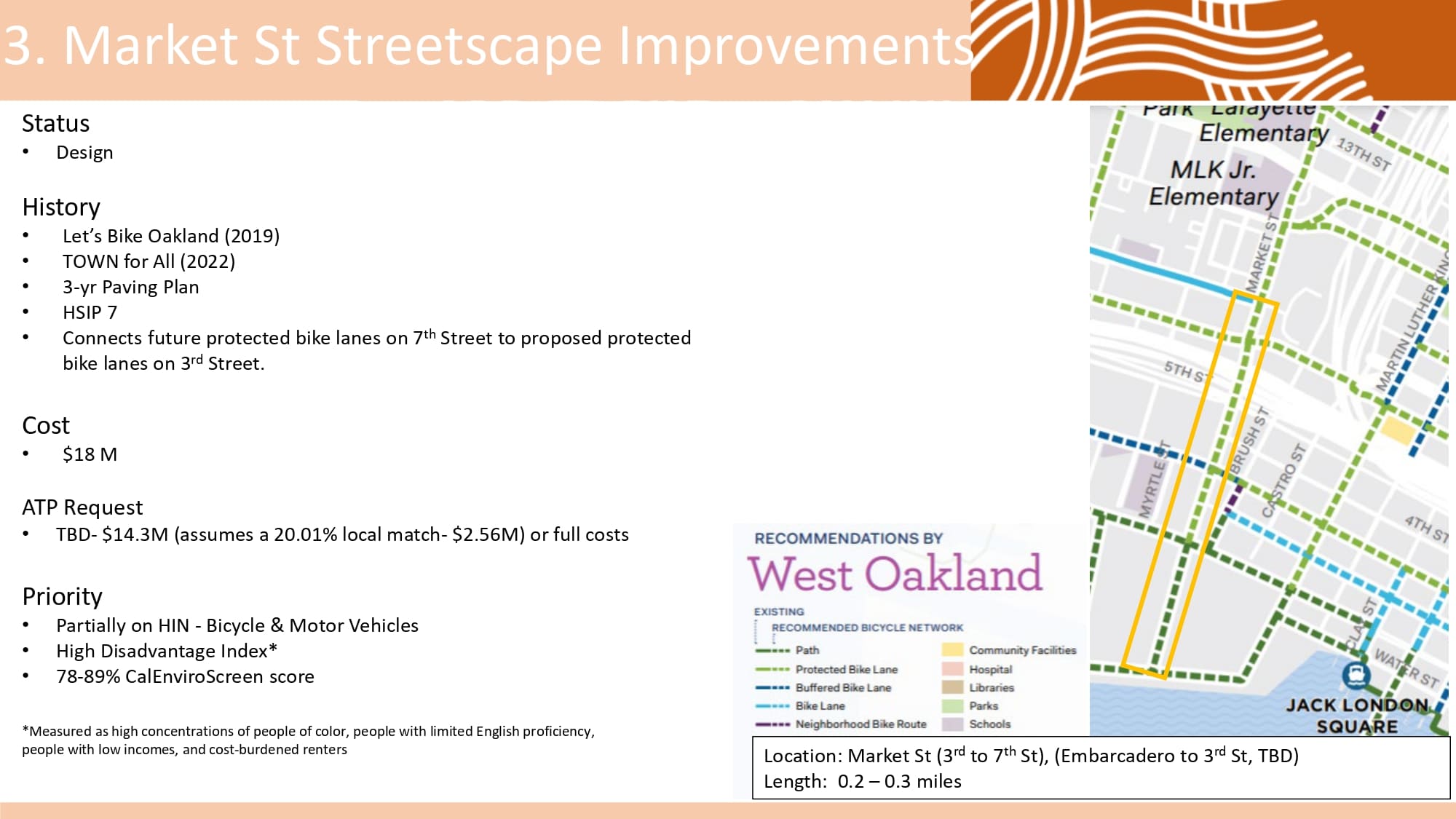 At the February 17, 2022 BPAC meeting, OakDOT Transportation Planner Julieth Ortiz presented on the proposed transportation projects for the Active Transportation Program (ATP) Cycle 6 and provided an update on the status of projects from previous ATP awards. ATP is a biannual competitive funding opportunity for projects that encourage increased bicycling and walking. The ATP is a state-administered program that distributes both state and federal funds. Applications for this year are due in June. The full presentation is below.