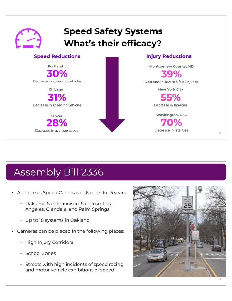 Assembly Bill 2336 (Friedman): Speed Safety System Pilot Program is a proposed state law that would allow Oakland and 5 other cities to administer these speed safety systems as a pilot program. Oakland would be permitted a total 18 safety systems administered by the Department of Transportation. Equity provisions include small fines ($50 for 11-15 mph over the speed limit, v. hundreds for traditional speeding tickets), removing interactions between police and the community at traffic stops that have the potential to escalate, a 50-80% fine reduction if unable to pay, opportunities for community service in lieu of fines, and extensive community involvement in drafting a Use Policy & Equity Analysis that includes locations selected.
