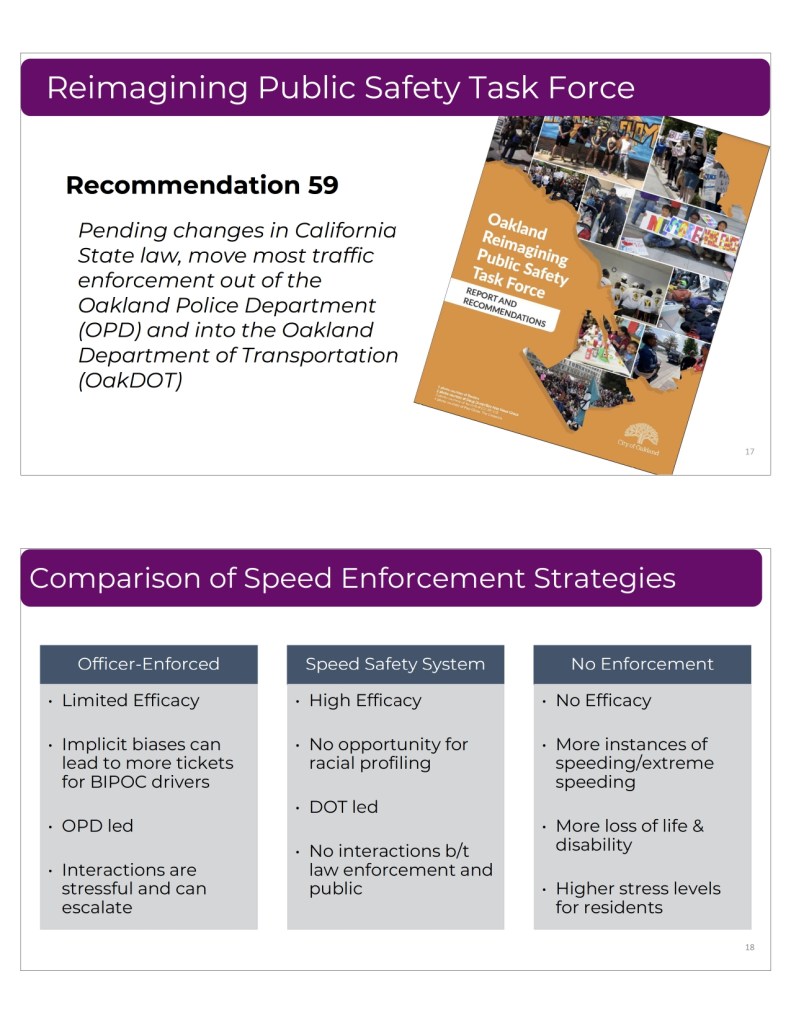 - OakDOT does not have a Traffic Enforcement Division and will need to scale existing resources (like the Parking Citation Assistance Center) and propose new positions in the General Budget to support this 5-year speed enforcement pilot.