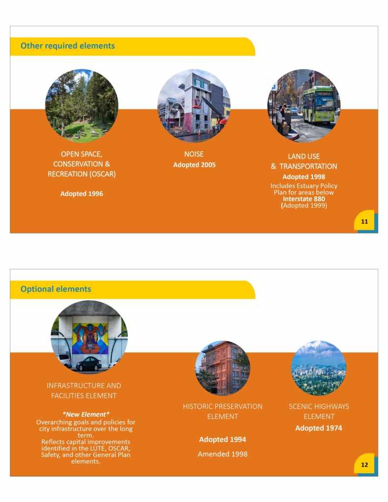 The City of Oakland is undertaking a comprehensive General Plan Update process in two phases. Phase I includes the update of the Housing and Safety Elements of the General Plan; creation of the City’s first Environmental Justice Element; associated amendments to other Elements of the General Plan, along with Zoning Code and map updates; Racial Equity Impact Analysis, and an Industrial Land Use Study. Phase I is anticipated to be completed by early 2023.
