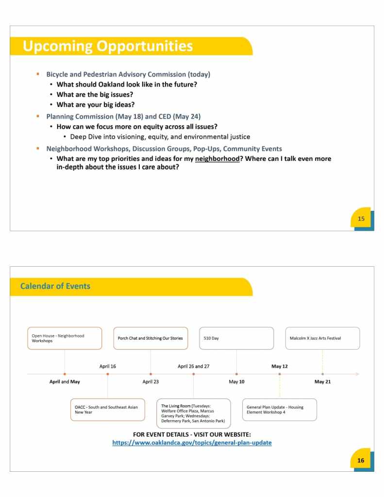 At the April 21, 2022 BPAC meeting, Strategic Planning Manager for the City of Oakland Planning Department, Laura Kaminski, presented on the upcoming General Plan update. The presentation and summary of discussion are below.