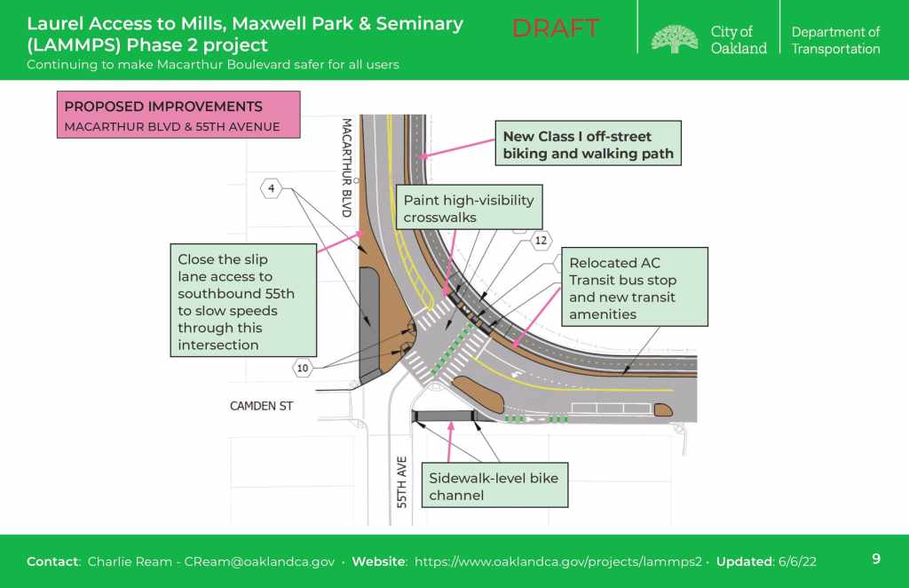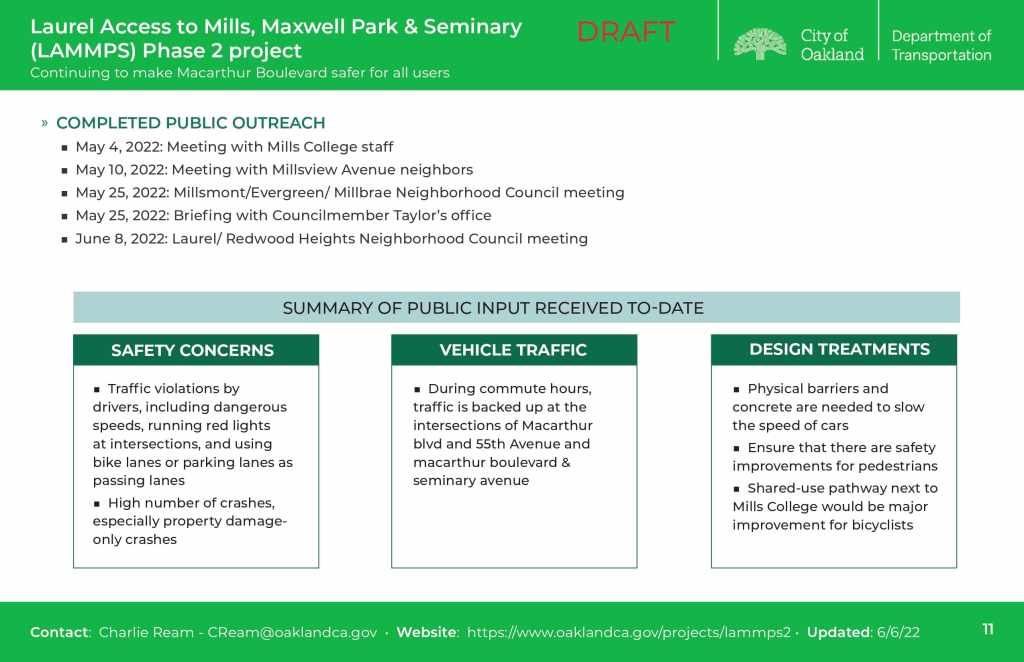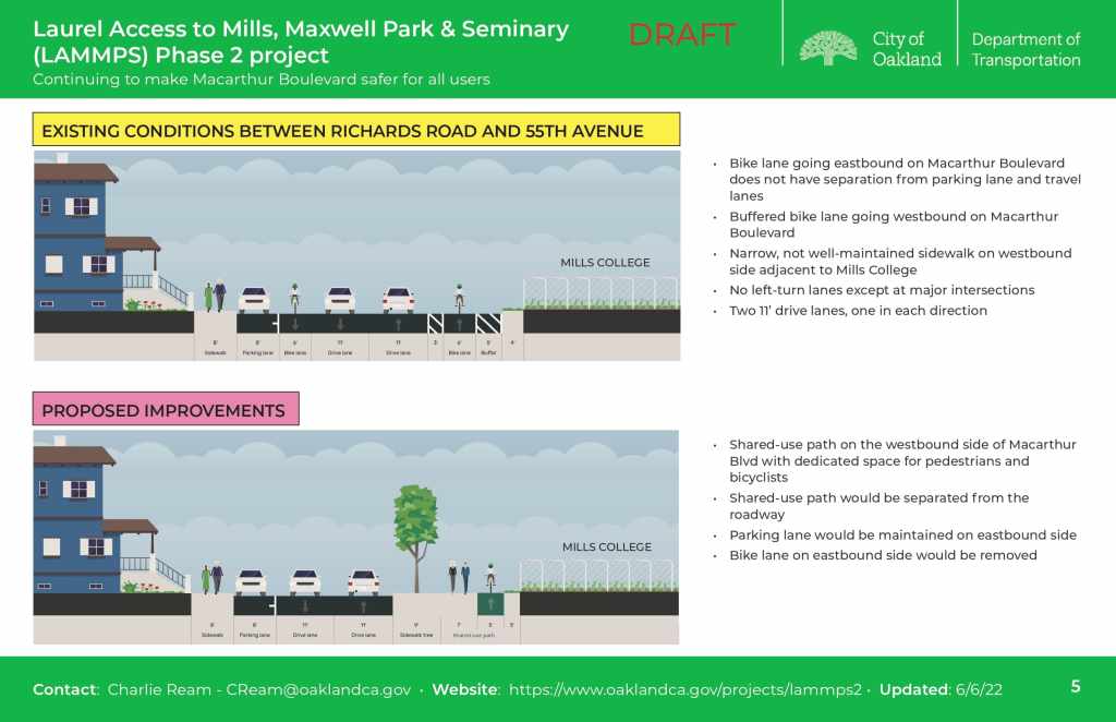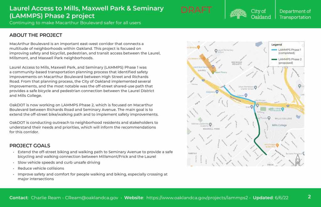 Laurel Access to Mills, Maxwell Park, and Seminary (LAMMPS) Phase 1 was a community-based transportation planning process that identified safety improvements on Macarthur Boulevard between High Street and Richards Road. From that planning process, the City of Oakland implemented several improvements, and the most notable was the off-street shared-use path that provides a safe bicycle and pedestrian connection between the Laurel District and Mills College.