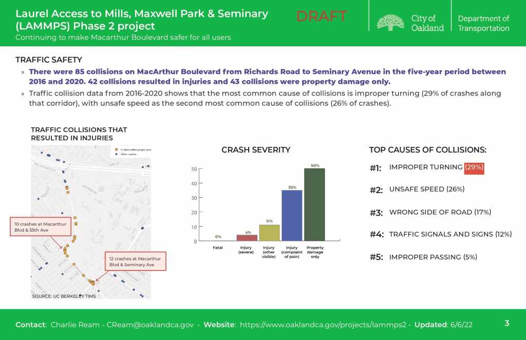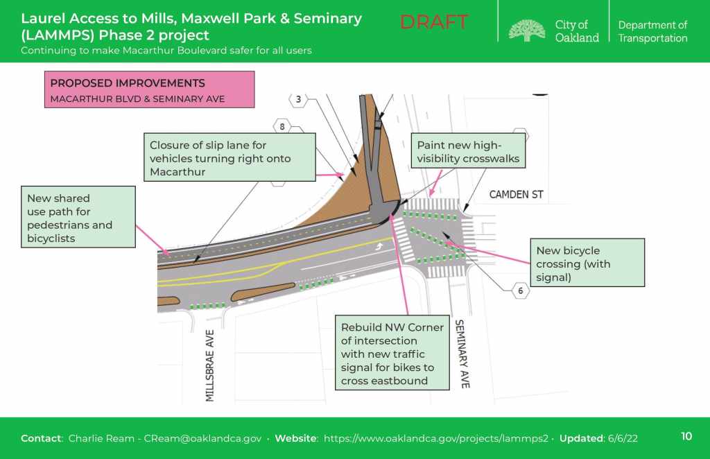 OakDOT is now working on LAMMPS Phase 2, which is focused on Macarthur Boulevard between Richards Road and Seminary Avenue. The main goal is to extend the off-street bike/walking path and to implement safety improvements.