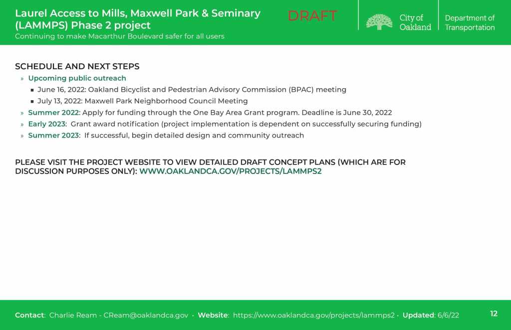 - June 16, 2022: Oakland Bicyclist and Pedestrian Advisory Commission (BPAC) meeting