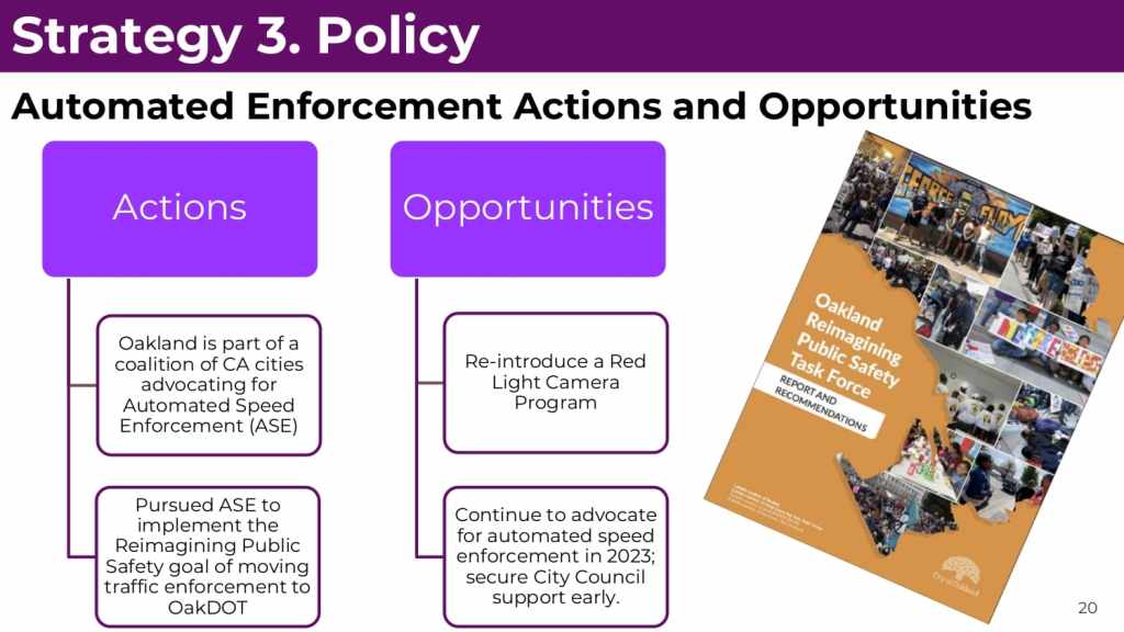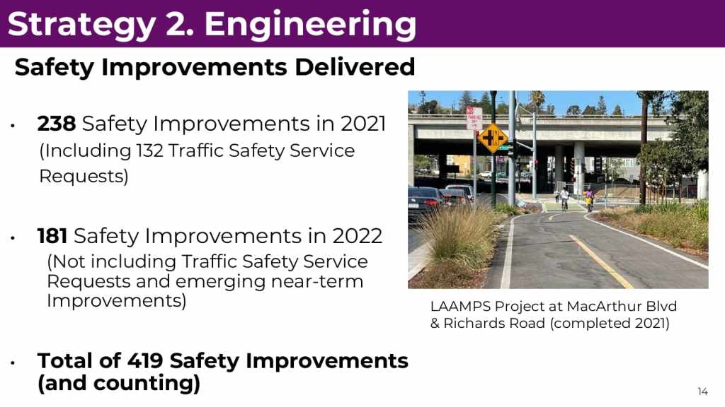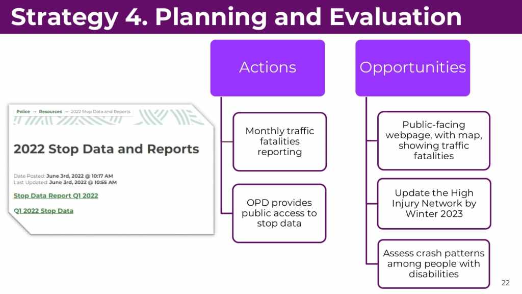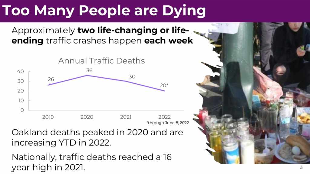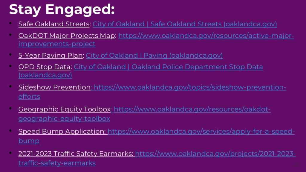 At the June 16, 2022 BPAC meeting, OakDOT Policy & Intergovernmental Affairs Advisor Nicole Ferrara presented updates on the Safe Oakland Streets (SOS) Initiative. SOS was launched in 2021 with the primary goal of preventing severe and fatal crashes and related disparities impacting Black, Indigenous, and People of Color (BIPOC) communities, persons with disabilities, seniors, children, and low-income populations. The presentation includes an overview of the initiative, progress made in 2021, and focal points for work in 2022 and beyond.
