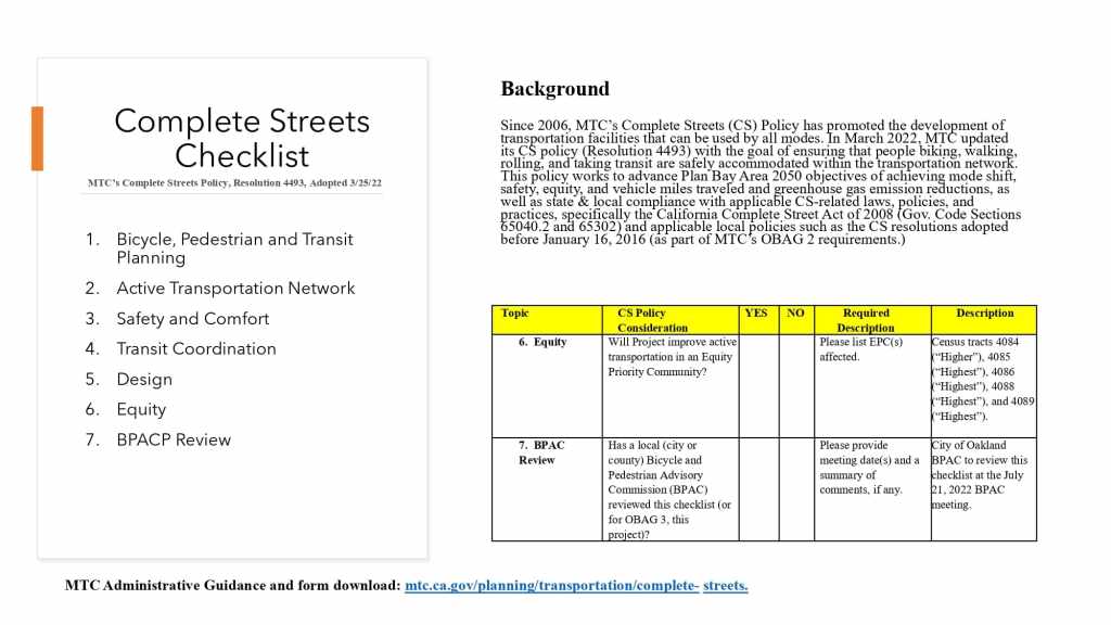 At the July 21, 2022 BPAC meeting, OakDOT Transportation Planner Manuel Corona, presented on two projects, the Bancroft Avenue Greenway project and the 73rd Avenue Active Routes to Transit project. These projects were heard at the February 17, 2022 BPAC meeting and have been submitted as Active Transportation Program (ATP) grant applications for the June 15th deadline. Staff requested the commission review the Metropolitan Transportation Commission (MTC) Complete Streets Checklists for each project and share comments back to Manuel Corona by July 28th, 2022.